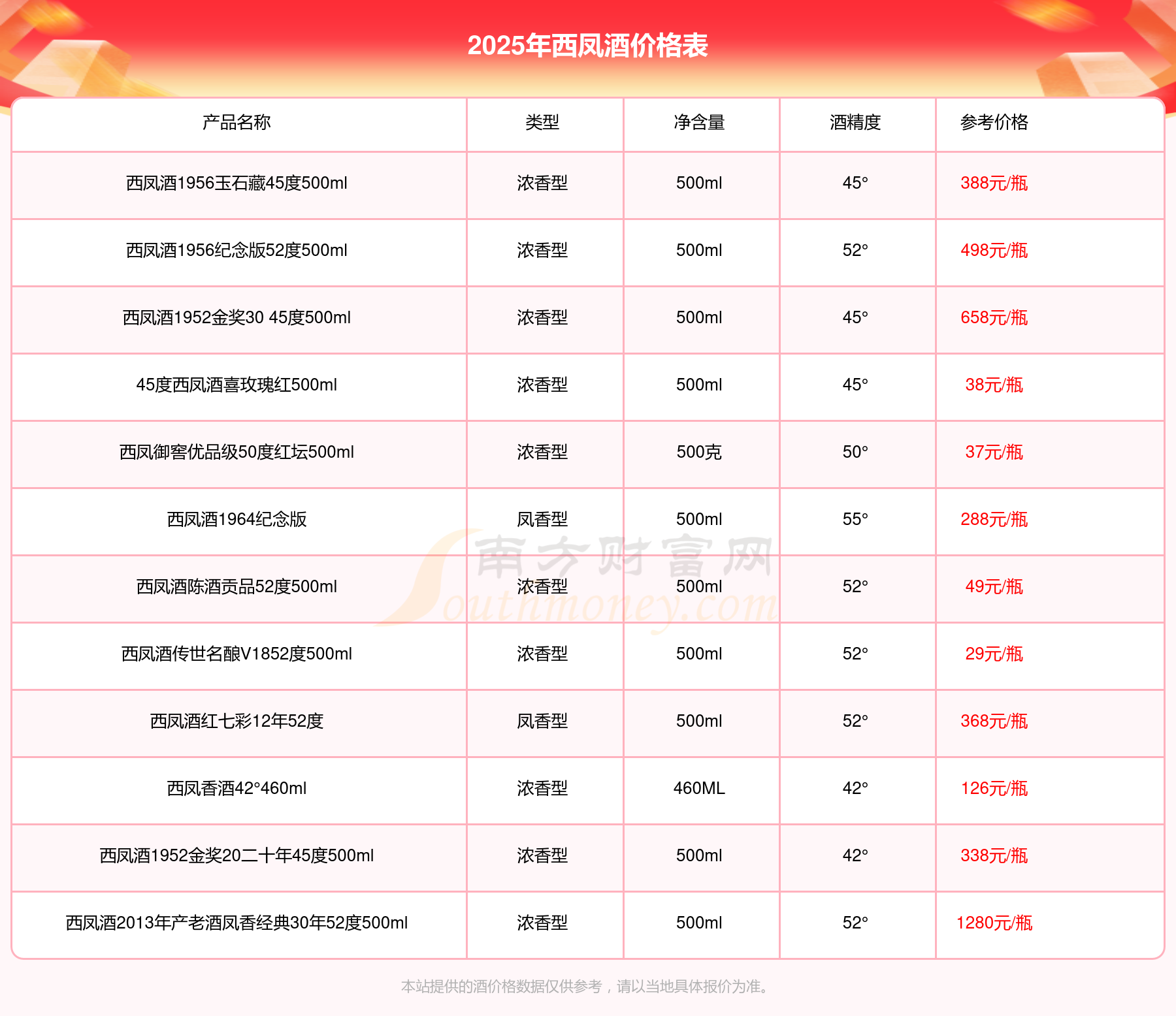 西鳳酒最新價格2025:西鳳酒 酒海私藏55度3000ml參考價8880元/瓶、西鳳酒1952金獎50 55度500ml參考價2380元/瓶、西鳳酒2013年產(chǎn)老酒鳳香經(jīng)典30年52度500ml參考價1280元/瓶、西鳳酒1956鉆石藏45度500ml參考價980元/瓶、西鳳酒1952金獎30 55度500ml參考價898元/瓶、西鳳酒鳳香經(jīng)典20年52度500ml參考價768元/瓶。