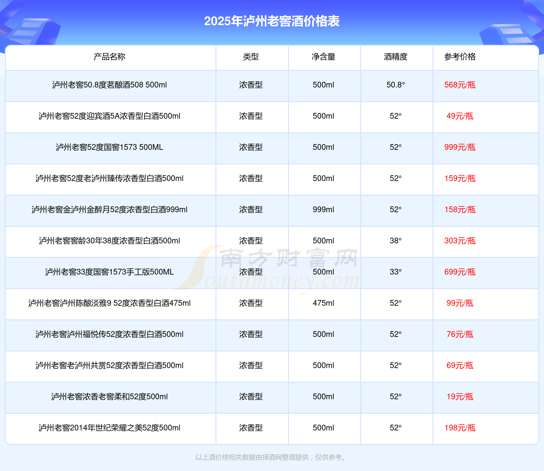 2025年瀘州老窖酒瀘州老窖國窖1573春釀鼠兆豐年E 55度、瀘州老窖國窖1573生命中的那壇酒55度014、瀘州老窖國窖1573春釀鼠兆豐年A 55度、瀘州老窖國窖1573生命中的那壇酒55度013濃香型白酒1000ml、瀘州老窖國窖1573生命中的那壇酒55度009 1000ml等最新價格如下:瀘州老窖國窖1573春釀鼠兆豐年E 55度參考價17999元/瓶、瀘州老窖國窖1573生命中的那壇酒55度014參考價9999元/瓶、瀘州老窖國窖1573春釀鼠兆豐年A 55度參考價5088元/瓶、瀘州老窖國窖1573生命中的那壇酒55度013濃香型白酒1000ml參考價4988元/瓶、瀘州老窖國窖1573生命中的那壇酒55度009 1000ml參考價4288元/瓶。
