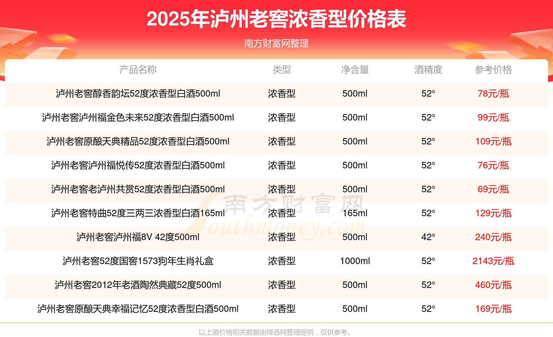 瀘州老窖濃香型酒最新價格2025:瀘州老窖國窖1573春釀鼠兆豐年E 55度參考價17999元/瓶、瀘州老窖國窖1573生命中的那壇酒55度014參考價9999元/瓶、瀘州老窖國窖1573春釀鼠兆豐年A 55度參考價5088元/瓶、瀘州老窖國窖1573生命中的那壇酒55度013濃香型白酒1000ml參考價4988元/瓶、瀘州老窖國窖1573生命中的那壇酒55度009 1000ml參考價4288元/瓶、瀘州老窖國窖1573中國品味52度濃香型白酒500ml參考價2888元/瓶。