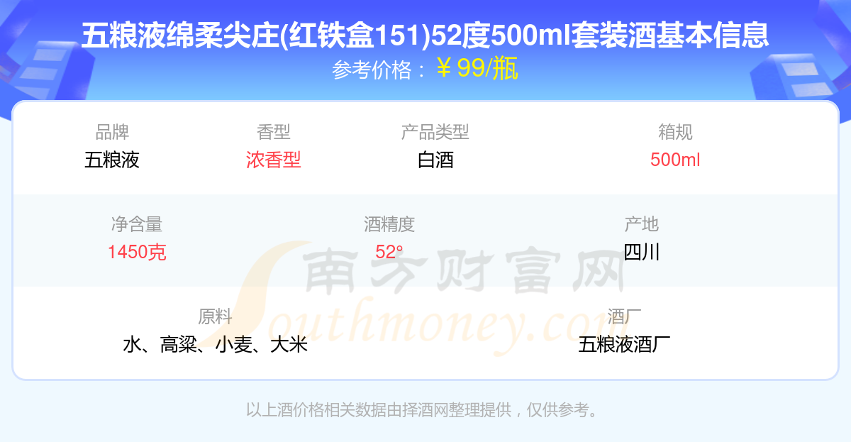 五糧液綿柔尖莊(紅鐵盒151)52度500ml套裝基本信息