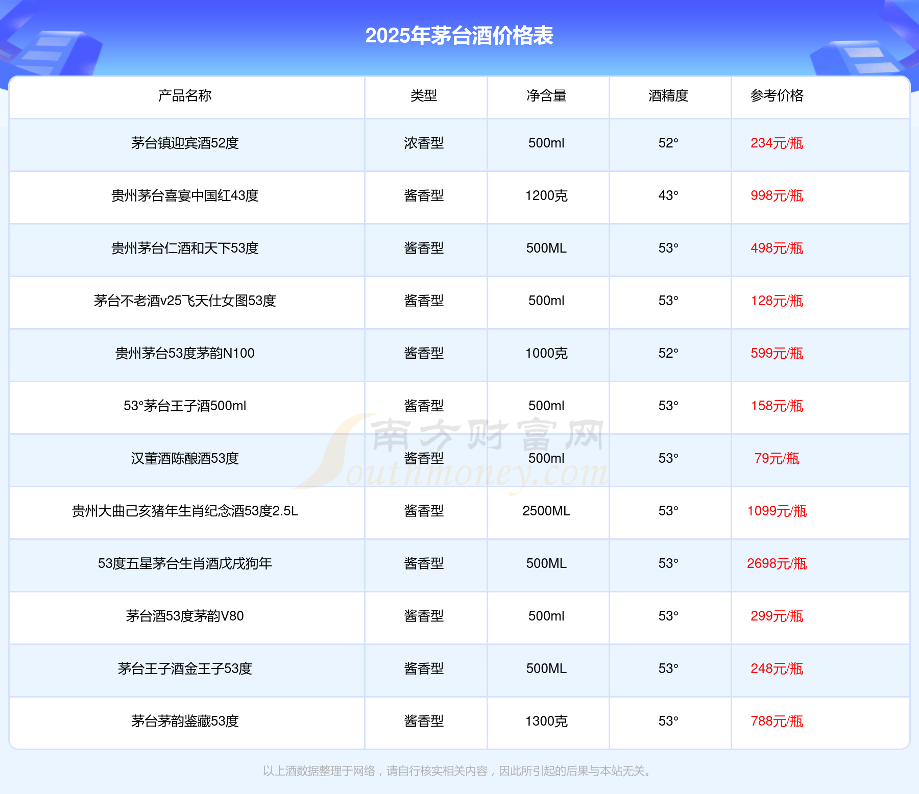 2025年茅臺(tái)價(jià)格最高的酒是華茅鑒藏 醬香型白酒 3L 53°,參考價(jià)8388元/瓶,最低的是張義齋52度原漿老窖酒,參考價(jià)58元/瓶,價(jià)格高低差為8330元/瓶。