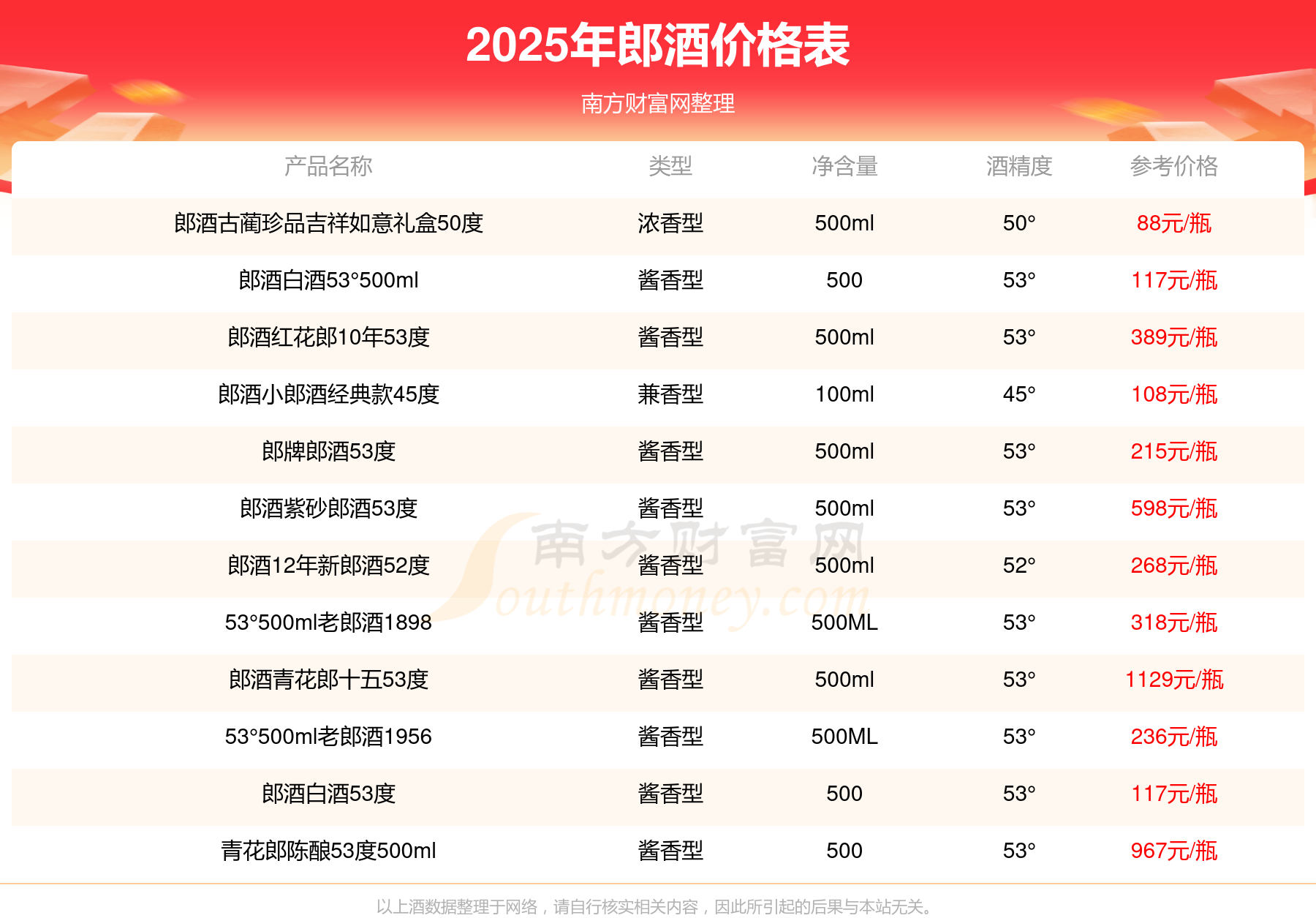 2025郎酒最新價(jià)格:郎酒青花郎十五53度參考價(jià)1129元/瓶、青花郎陳釀53度500ml參考價(jià)967元/瓶、郎酒紫砂郎酒53度參考價(jià)598元/瓶、郎酒紅花郎10年53度參考價(jià)389元/瓶、53°500ml老郎酒1898參考價(jià)318元/瓶、郎酒12年新郎酒52度參考價(jià)268元/瓶、53°500ml老郎酒1956參考價(jià)236元/瓶、郎牌郎酒53度參考價(jià)215元/瓶。