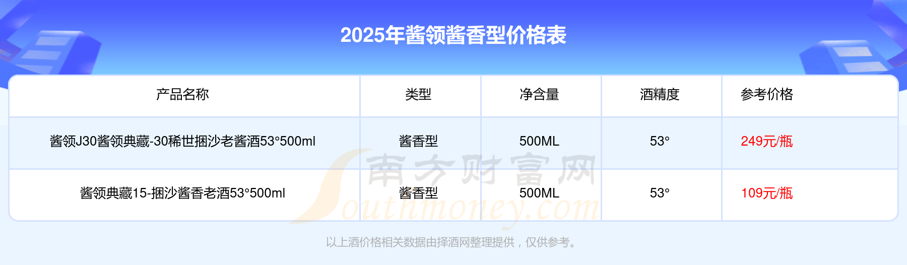 2025醬領醬香型酒最新價格:醬領J30醬領典藏-30稀世捆沙老醬酒53°500ml參考價249元/瓶、醬領典藏15-捆沙醬香老酒53°500ml參考價109元/瓶。