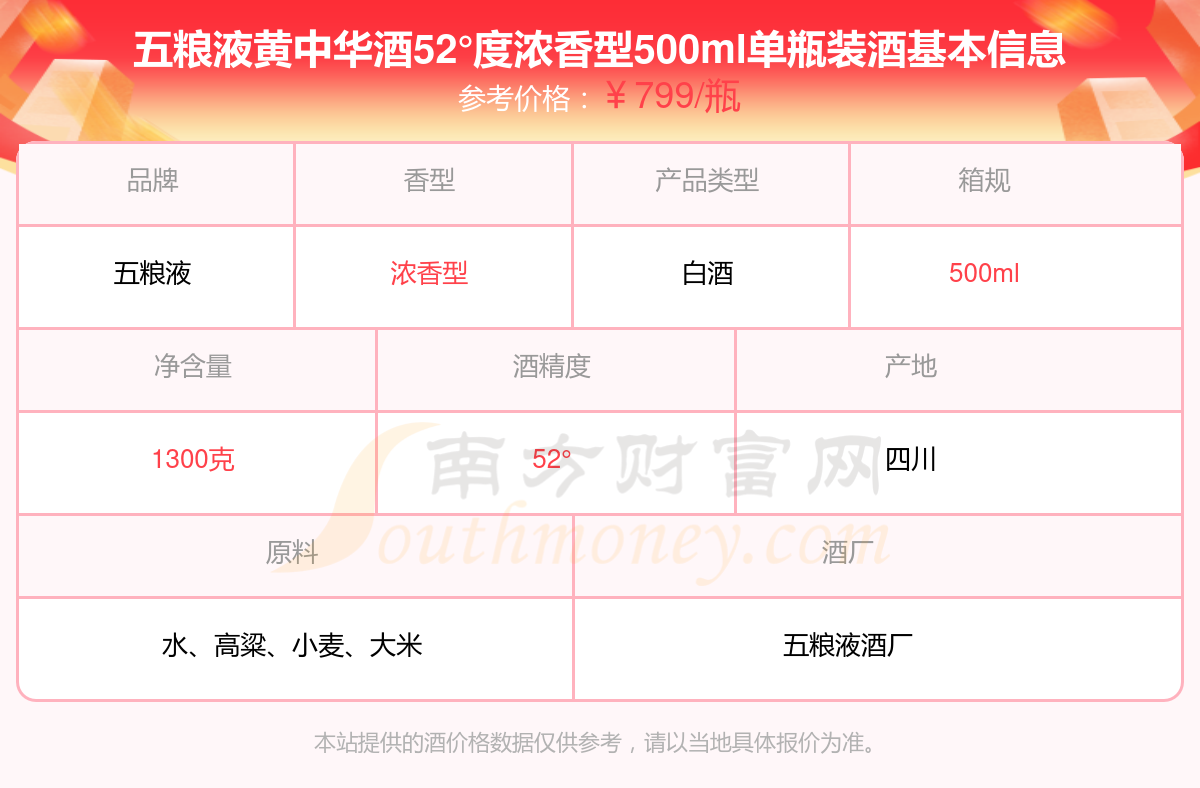五糧液黃中華酒52°度濃香型500ml單瓶裝基本信息