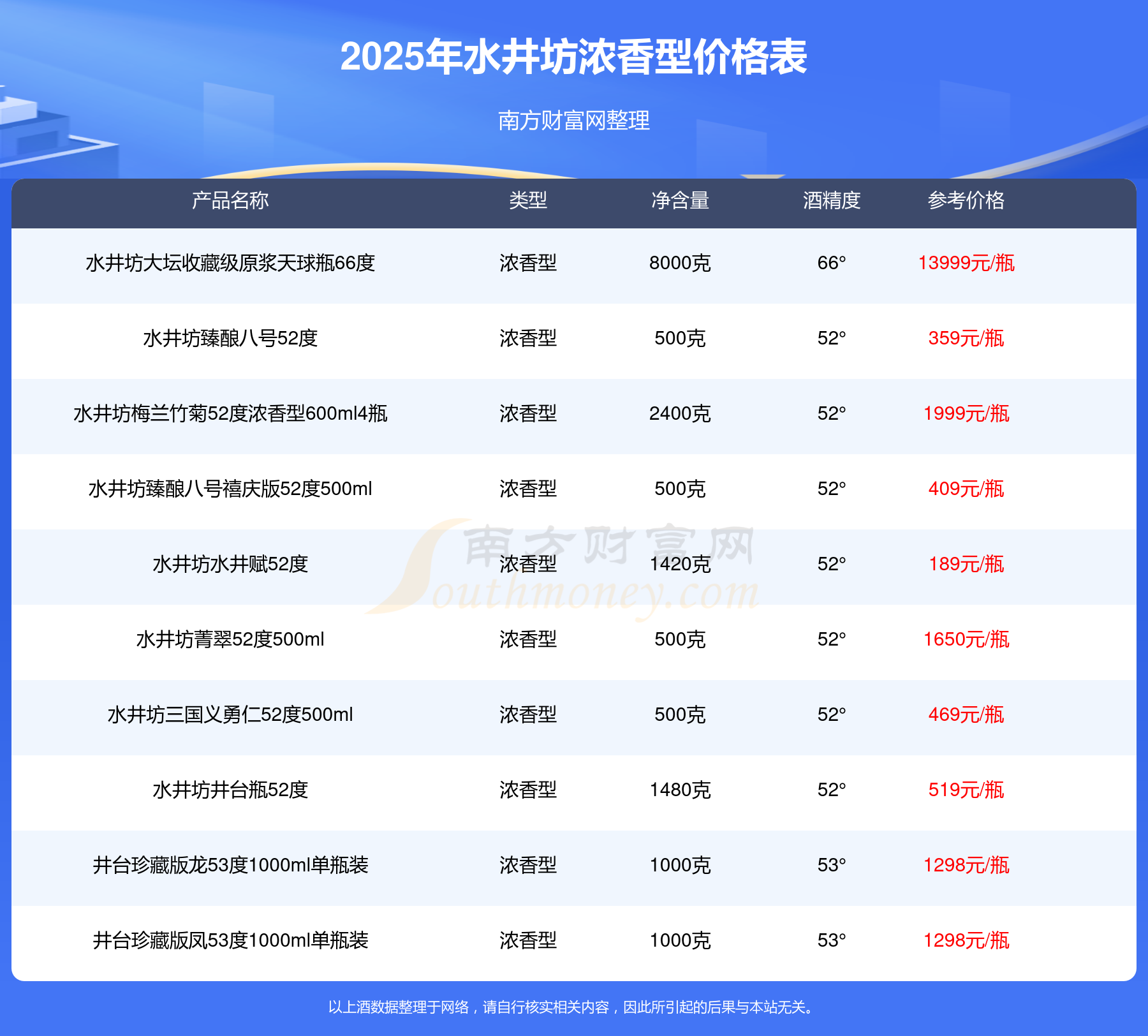 2025年水井坊濃香型價格最高的酒是水井坊大壇收藏級原漿天球瓶66度,參考價13999元/瓶,最低的是水井坊小水井52度500ml,參考價158元/瓶,價格高低差為13841元/瓶。