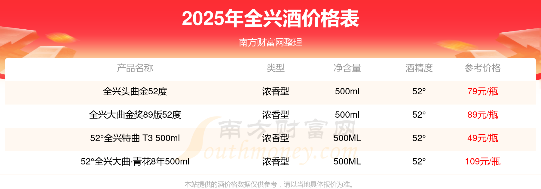 2025年,52°全興大曲·青花8年500ml、全興大曲金獎89版52度、全興頭曲金52度等全興酒價格如下:52°全興大曲·青花8年500ml參考價109元/瓶、全興大曲金獎89版52度參考價89元/瓶、全興頭曲金52度參考價79元/瓶。