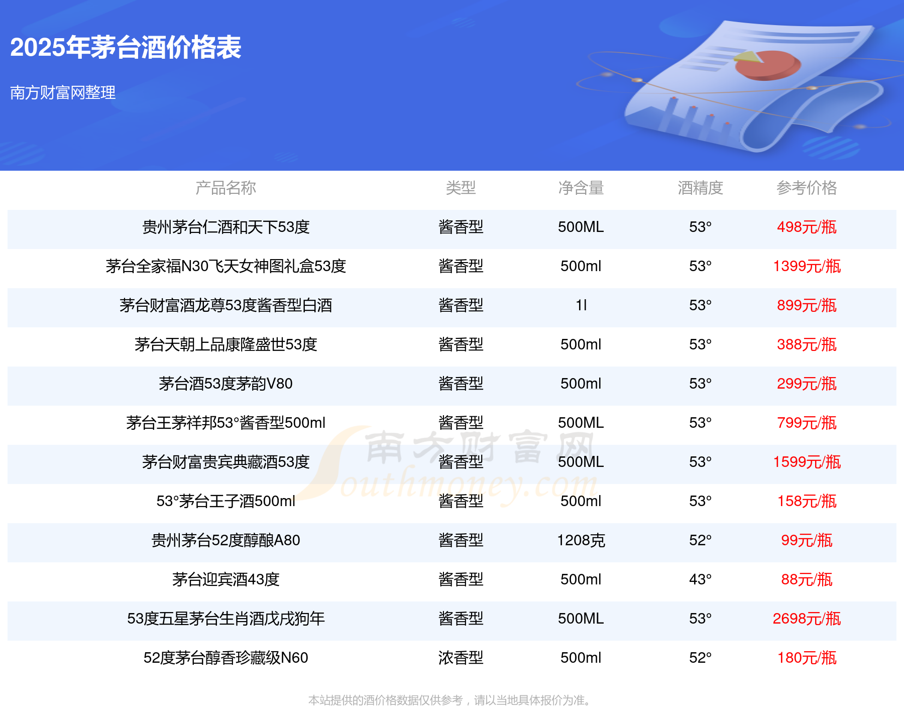 2025茅臺酒最新價格:華茅鑒藏 醬香型白酒 3L 53°參考價8388元/瓶、53度五星茅臺生肖酒丁酉雞年參考價2798元/瓶、貴州茅臺己亥豬年生肖酒53°500ml參考價2699元/瓶、53度五星茅臺生肖酒戊戌狗年參考價2698元/瓶。