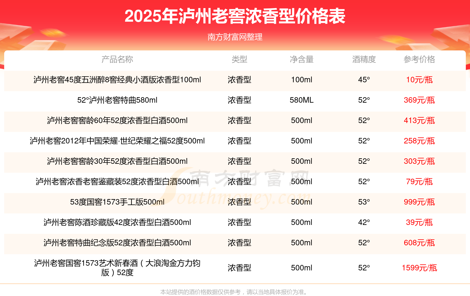 2025年,瀘州老窖國(guó)窖1573春釀鼠兆豐年E 55度、瀘州老窖國(guó)窖1573生命中的那壇酒55度014、瀘州老窖國(guó)窖1573春釀鼠兆豐年A 55度、瀘州老窖國(guó)窖1573生命中的那壇酒55度013濃香型白酒1000ml、瀘州老窖國(guó)窖1573生命中的那壇酒55度009 1000ml、瀘州老窖國(guó)窖1573中國(guó)品味52度濃香型白酒500ml等瀘州老窖濃香型酒價(jià)格如下:瀘州老窖國(guó)窖1573春釀鼠兆豐年E 55度參考價(jià)17999元/瓶、瀘州老窖國(guó)窖1573生命中的那壇酒55度014參考價(jià)9999元/瓶、瀘州老窖國(guó)窖1573春釀鼠兆豐年A 55度參考價(jià)5088元/瓶、瀘州老窖國(guó)窖1573生命中的那壇酒55度013濃香型白酒1000ml參考價(jià)4988元/瓶、瀘州老窖國(guó)窖1573生命中的那壇酒55度009 1000ml參考價(jià)4288元/瓶、瀘州老窖國(guó)窖1573中國(guó)品味52度濃香型白酒500ml參考價(jià)2888元/瓶。
