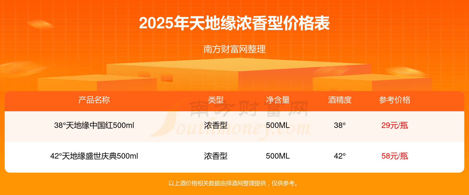 2025年天地緣濃香型價格最高的酒是42°天地緣盛世慶典500ml,參考價58元/瓶,最低的是38°天地緣中國紅500ml,參考價29元/瓶,價格高低差為29元/瓶。