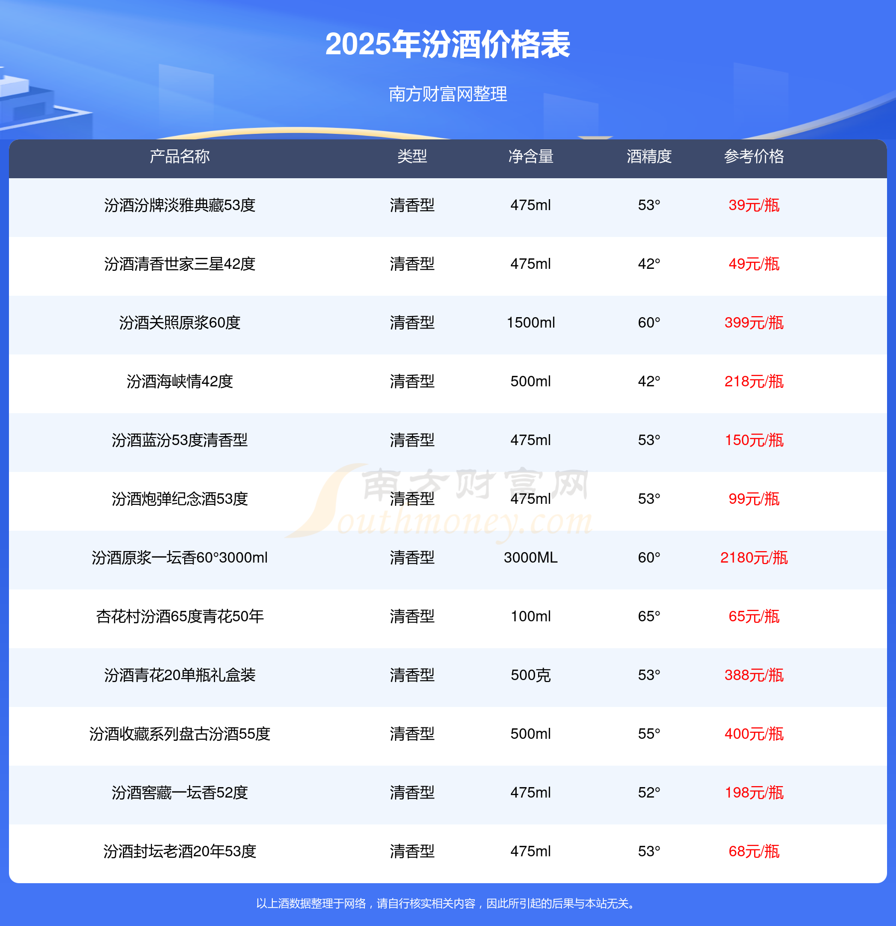 2025年,汾酒原漿一壇香60°3000ml、汾酒原漿一壇香60°1500ml、42度汾酒青花25、汾酒收藏系列盤古汾酒55度、汾酒關(guān)照原漿60度等汾酒價(jià)格如下:汾酒原漿一壇香60°3000ml參考價(jià)2180元/瓶、汾酒原漿一壇香60°1500ml參考價(jià)1536元/瓶、42度汾酒青花25參考價(jià)598元/瓶、汾酒收藏系列盤古汾酒55度參考價(jià)400元/瓶、汾酒關(guān)照原漿60度參考價(jià)399元/瓶。