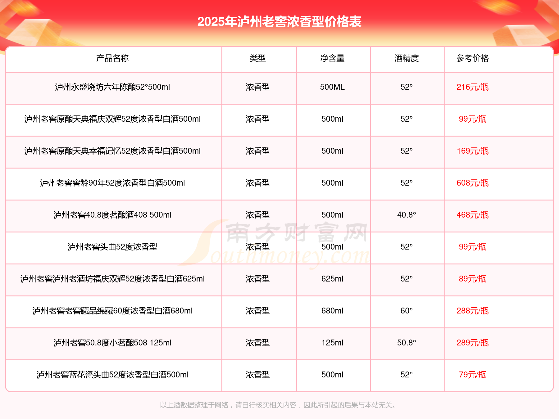 2025年,瀘州老窖國窖1573春釀鼠兆豐年E 55度、瀘州老窖國窖1573生命中的那壇酒55度014、瀘州老窖國窖1573春釀鼠兆豐年A 55度、瀘州老窖國窖1573生命中的那壇酒55度013濃香型白酒1000ml、瀘州老窖國窖1573生命中的那壇酒55度009 1000ml、瀘州老窖國窖1573中國品味52度濃香型白酒500ml等瀘州老窖濃香型酒價(jià)格如下:瀘州老窖國窖1573春釀鼠兆豐年E 55度參考價(jià)17999元/瓶、瀘州老窖國窖1573生命中的那壇酒55度014參考價(jià)9999元/瓶、瀘州老窖國窖1573春釀鼠兆豐年A 55度參考價(jià)5088元/瓶、瀘州老窖國窖1573生命中的那壇酒55度013濃香型白酒1000ml參考價(jià)4988元/瓶、瀘州老窖國窖1573生命中的那壇酒55度009 1000ml參考價(jià)4288元/瓶、瀘州老窖國窖1573中國品味52度濃香型白酒500ml參考價(jià)2888元/瓶。