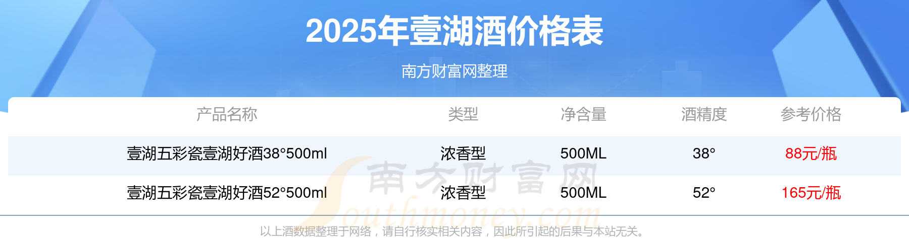 2025年,壹湖五彩瓷壹湖好酒52°500ml、壹湖五彩瓷壹湖好酒38°500ml等壹湖酒價(jià)格如下:壹湖五彩瓷壹湖好酒52°500ml參考價(jià)165元/瓶、壹湖五彩瓷壹湖好酒38°500ml參考價(jià)88元/瓶。