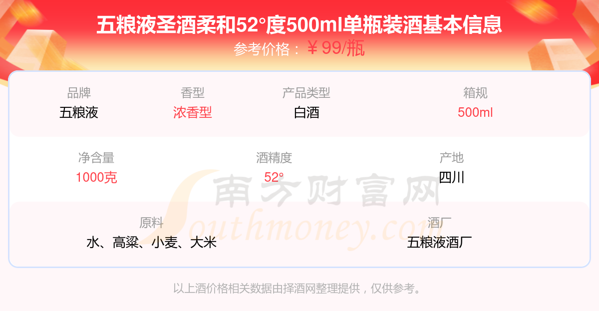 五糧液圣酒柔和52°度500ml單瓶裝基本信息