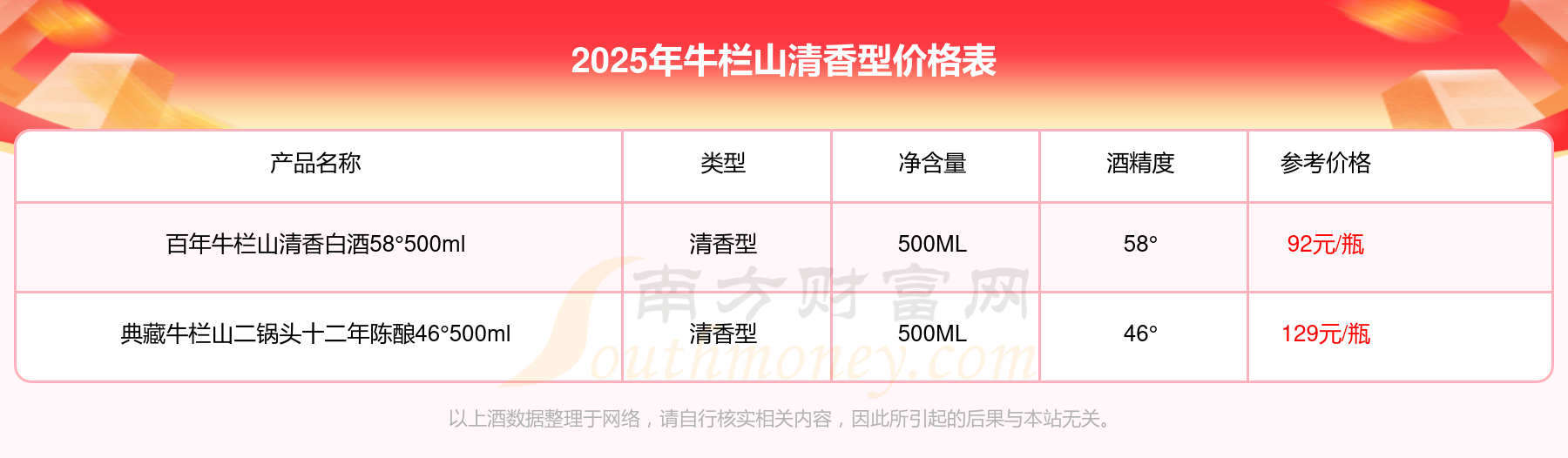牛欄山清香型酒最新價(jià)格2025:典藏牛欄山二鍋頭十二年陳釀46°500ml參考價(jià)129元/瓶、百年牛欄山清香白酒58°500ml參考價(jià)92元/瓶。