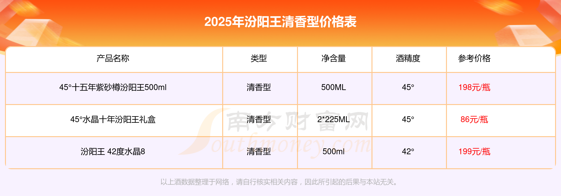 2025年,汾陽王 42度水晶8、45°十五年紫砂樽汾陽王500ml、45°水晶十年汾陽王禮盒等汾陽王清香型酒價(jià)格如下:汾陽王 42度水晶8參考價(jià)199元/瓶、45°十五年紫砂樽汾陽王500ml參考價(jià)198元/瓶、45°水晶十年汾陽王禮盒參考價(jià)86元/瓶。