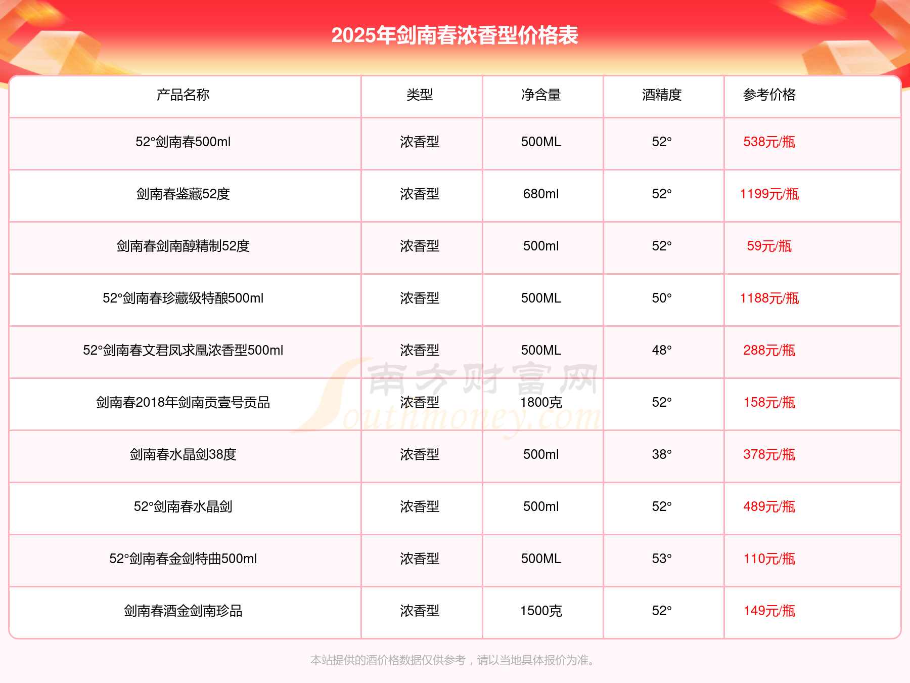2025年劍南春濃香型酒劍南春鑒藏52度、52°劍南春珍藏級特釀500ml、劍南春酒東方紅1949等最新價格如下:劍南春鑒藏52度參考價1199元/瓶、52°劍南春珍藏級特釀500ml參考價1188元/瓶、劍南春酒東方紅1949參考價1099元/瓶。
