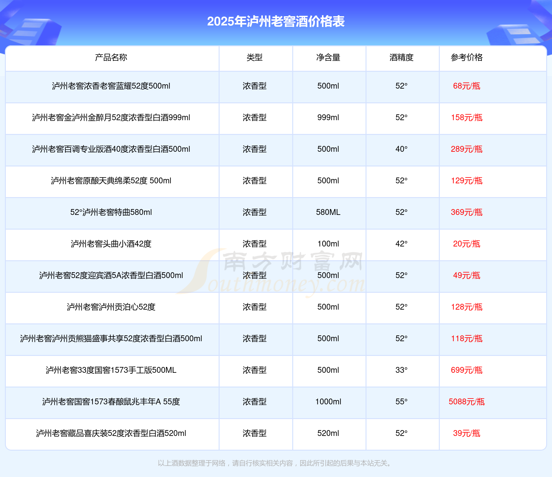 2025年,瀘州老窖國窖1573春釀鼠兆豐年E 55度、瀘州老窖國窖1573生命中的那壇酒55度014、瀘州老窖國窖1573春釀鼠兆豐年A 55度、瀘州老窖國窖1573生命中的那壇酒55度013濃香型白酒1000ml、瀘州老窖國窖1573生命中的那壇酒55度009 1000ml、瀘州老窖國窖1573中國品味52度濃香型白酒500ml、瀘州老窖國窖1573許燎源概念作品58度濃香型白酒1000ml、瀘州老窖52度國窖1573狗年生肖禮盒等瀘州老窖酒價格如下:瀘州老窖國窖1573春釀鼠兆豐年E 55度參考價17999元/瓶、瀘州老窖國窖1573生命中的那壇酒55度014參考價9999元/瓶、瀘州老窖國窖1573春釀鼠兆豐年A 55度參考價5088元/瓶、瀘州老窖國窖1573生命中的那壇酒55度013濃香型白酒1000ml參考價4988元/瓶、瀘州老窖國窖1573生命中的那壇酒55度009 1000ml參考價4288元/瓶、瀘州老窖國窖1573中國品味52度濃香型白酒500ml參考價2888元/瓶、瀘州老窖國窖1573許燎源概念作品58度濃香型白酒1000ml參考價2680元/瓶、瀘州老窖52度國窖1573狗年生肖禮盒參考價2143元/瓶。