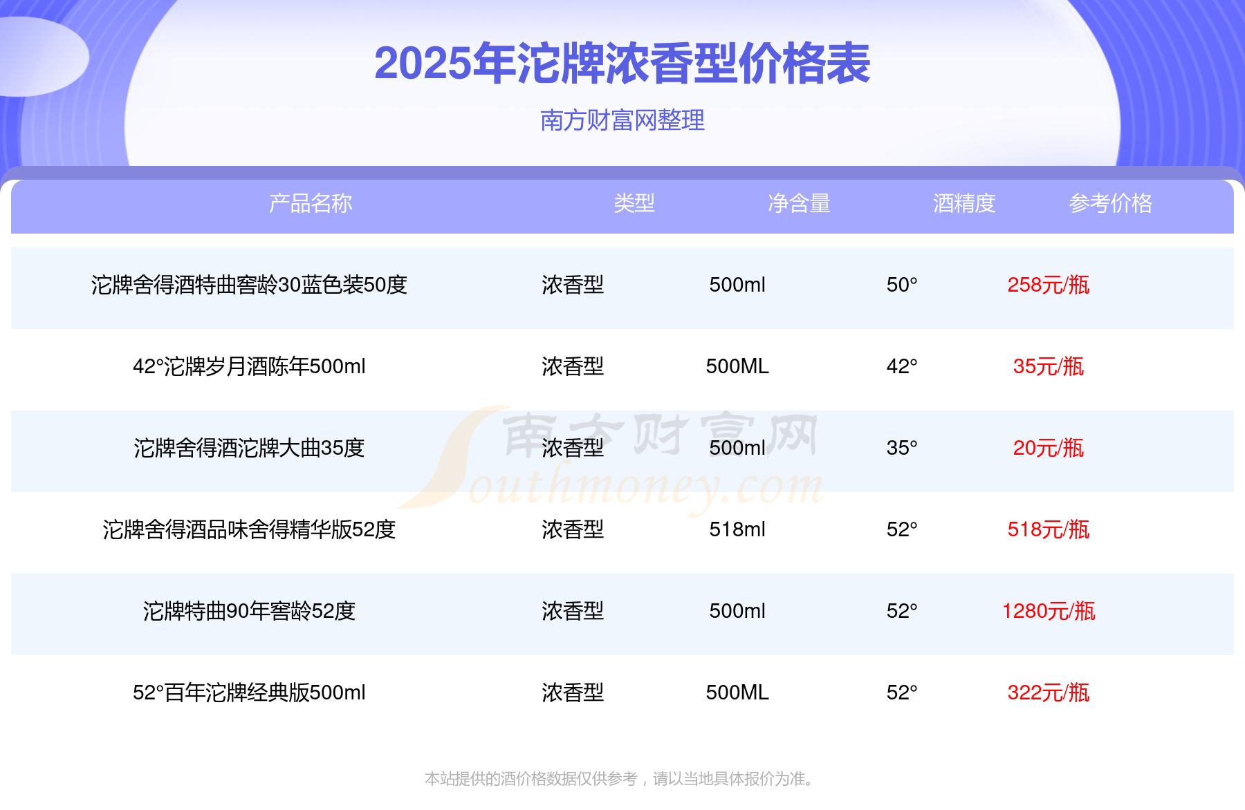 2025沱牌濃香型酒最新價(jià)格:沱牌特曲90年窖齡52度參考價(jià)1280元/瓶、沱牌舍得酒品味舍得精華版52度參考價(jià)518元/瓶、52°百年沱牌經(jīng)典版500ml參考價(jià)322元/瓶、沱牌舍得酒特曲窖齡30藍(lán)色裝50度參考價(jià)258元/瓶、42°沱牌歲月酒陳年500ml參考價(jià)35元/瓶、沱牌舍得酒沱牌大曲35度參考價(jià)20元/瓶。