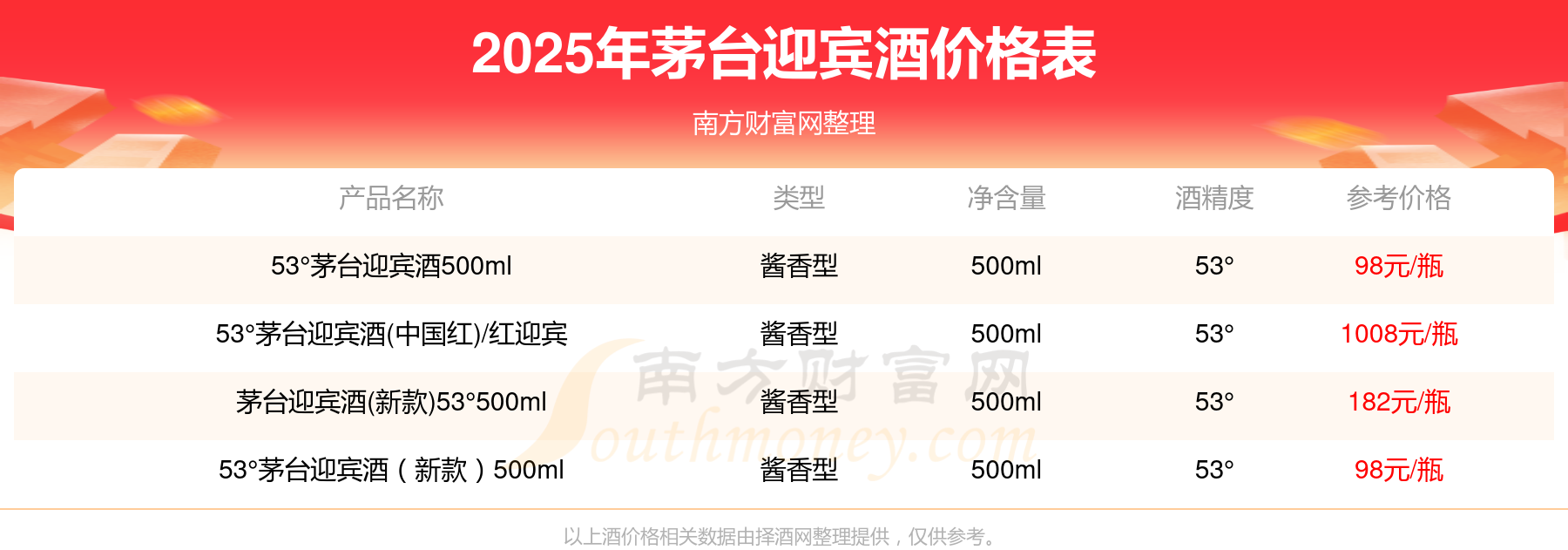 53°茅臺迎賓酒(中國紅)/紅迎賓參考價1008元/瓶、茅臺迎賓酒(新款)53°500ml參考價182元/瓶、53°茅臺迎賓酒(新款)500ml參考價98元/瓶。