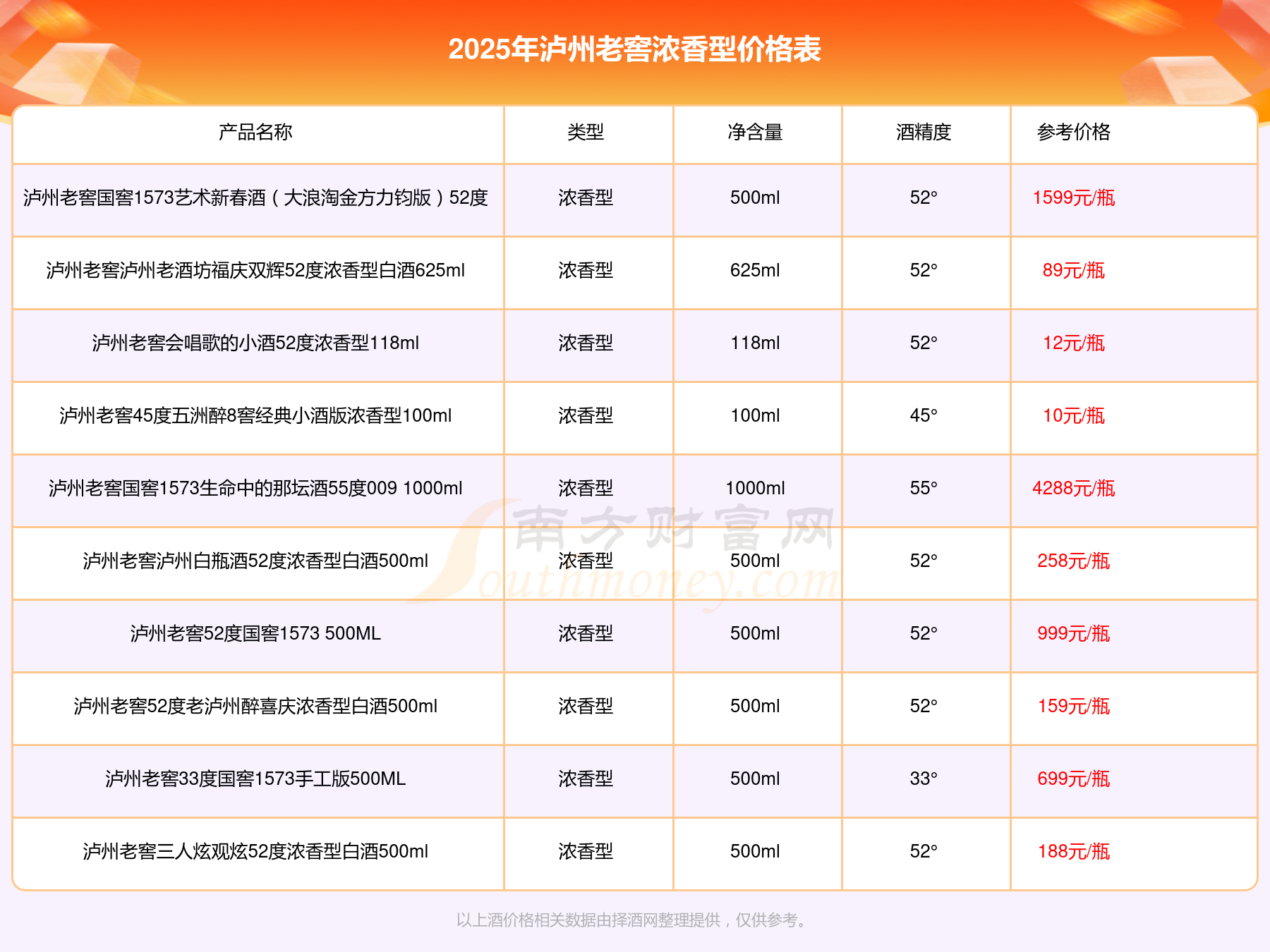 瀘州老窖濃香型酒最新價(jià)格2025:瀘州老窖國窖1573春釀鼠兆豐年E 55度參考價(jià)17999元/瓶、瀘州老窖國窖1573生命中的那壇酒55度014參考價(jià)9999元/瓶、瀘州老窖國窖1573春釀鼠兆豐年A 55度參考價(jià)5088元/瓶、瀘州老窖國窖1573生命中的那壇酒55度013濃香型白酒1000ml參考價(jià)4988元/瓶、瀘州老窖國窖1573生命中的那壇酒55度009 1000ml參考價(jià)4288元/瓶、瀘州老窖國窖1573中國品味52度濃香型白酒500ml參考價(jià)2888元/瓶、瀘州老窖國窖1573許燎源概念作品58度濃香型白酒1000ml參考價(jià)2680元/瓶。