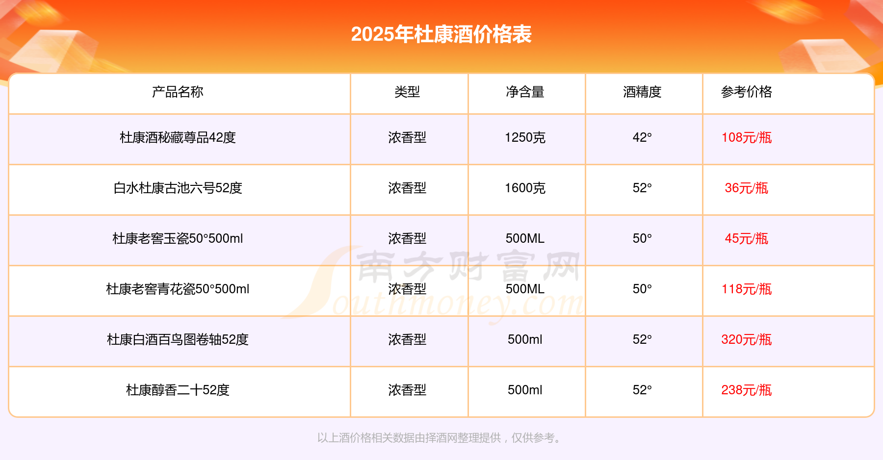 2025年,杜康白酒百鳥圖卷軸52度、杜康醇香二十52度、杜康老窖青花瓷50°500ml、杜康酒秘藏尊品42度等杜康酒價格如下:杜康白酒百鳥圖卷軸52度參考價320元/瓶、杜康醇香二十52度參考價238元/瓶、杜康老窖青花瓷50°500ml參考價118元/瓶、杜康酒秘藏尊品42度參考價108元/瓶。