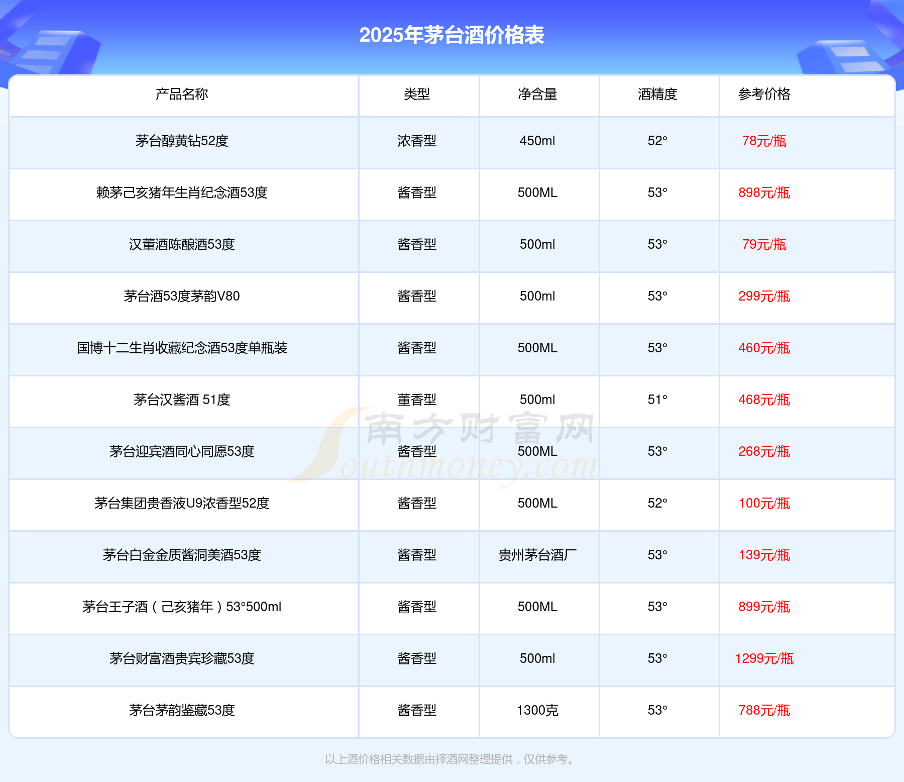 2025茅臺(tái)酒最新價(jià)格:華茅鑒藏 醬香型白酒 3L 53°參考價(jià)8388元/瓶、53度五星茅臺(tái)生肖酒丁酉雞年參考價(jià)2798元/瓶、貴州茅臺(tái)己亥豬年生肖酒53°500ml參考價(jià)2699元/瓶、53度五星茅臺(tái)生肖酒戊戌狗年參考價(jià)2698元/瓶、飛天茅臺(tái)53°500ml(2015年)參考價(jià)2199元/瓶、茅臺(tái)王子酒己亥豬年生肖紀(jì)念酒53度2.5L參考價(jià)2099元/瓶、茅臺(tái)1935醬香型53度參考價(jià)1799元/瓶、茅臺(tái)財(cái)富貴賓典藏酒53度參考價(jià)1599元/瓶。