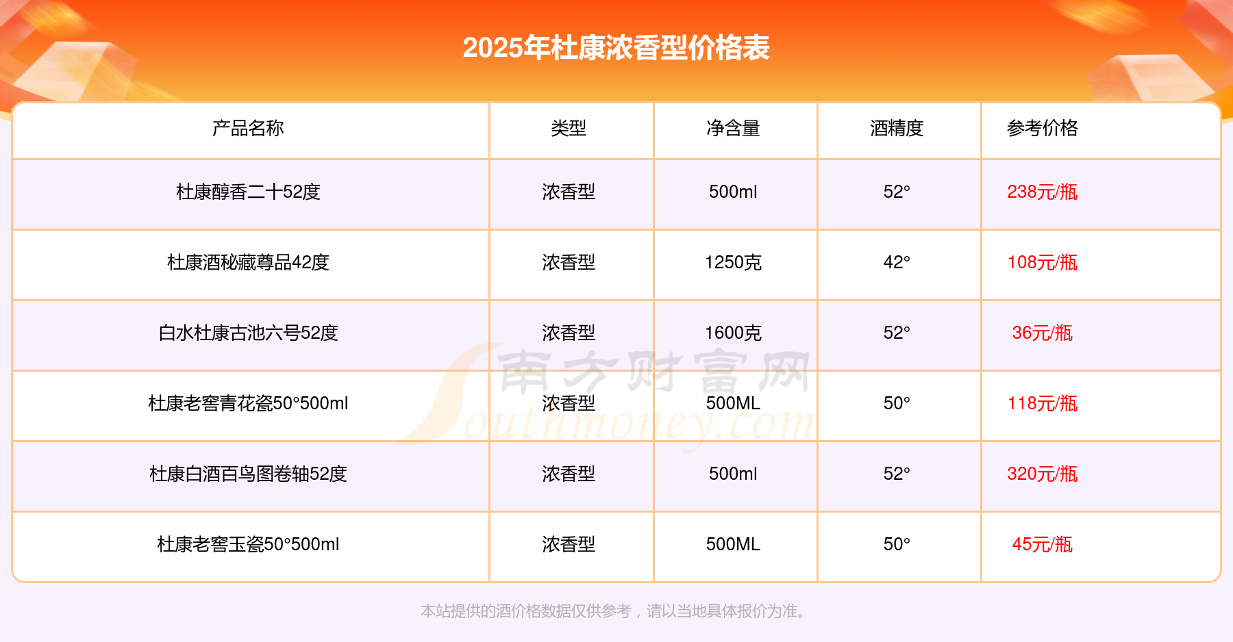 杜康白酒百鳥圖卷軸52度參考價320元/瓶、杜康醇香二十52度參考價238元/瓶、杜康老窖青花瓷50°500ml參考價118元/瓶、杜康酒秘藏尊品42度參考價108元/瓶、杜康老窖玉瓷50°500ml參考價45元/瓶、白水杜康古池六號52度參考價36元/瓶。