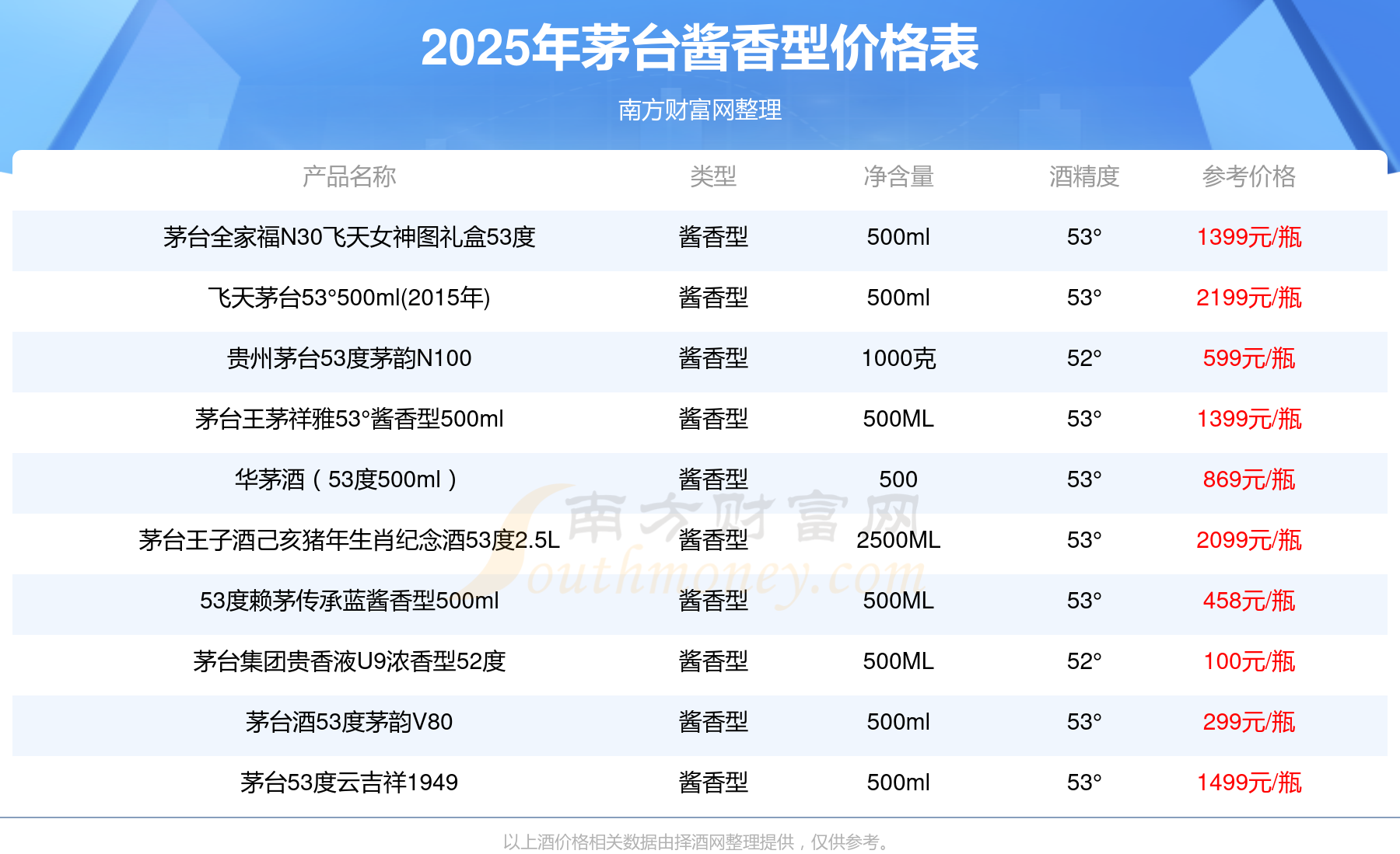 2025年茅臺醬香型酒華茅鑒藏 醬香型白酒 3L 53°、53度五星茅臺生肖酒丁酉雞年、貴州茅臺己亥豬年生肖酒53°500ml、53度五星茅臺生肖酒戊戌狗年、飛天茅臺53°500ml(2015年)等最新價格如下:華茅鑒藏 醬香型白酒 3L 53°參考價8388元/瓶、53度五星茅臺生肖酒丁酉雞年參考價2798元/瓶、貴州茅臺己亥豬年生肖酒53°500ml參考價2699元/瓶、53度五星茅臺生肖酒戊戌狗年參考價2698元/瓶、飛天茅臺53°500ml(2015年)參考價2199元/瓶。