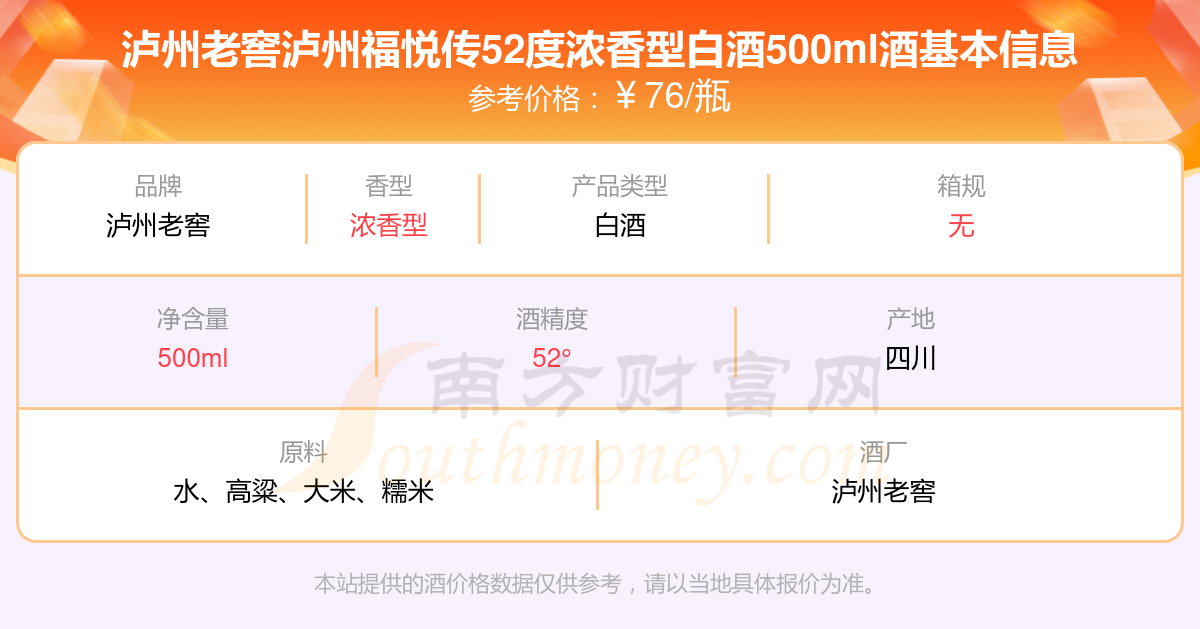 瀘州老窖瀘州福悅傳52度濃香型白酒500ml基本信息