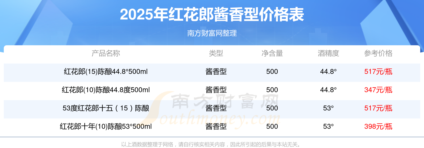 53度紅花郎十五(15)陳釀參考價(jià)517元/瓶、紅花郎(15)陳釀44.8°500ml參考價(jià)517元/瓶、紅花郎十年(10)陳釀53°500ml參考價(jià)398元/瓶、紅花郎(10)陳釀44.8度500ml參考價(jià)347元/瓶。