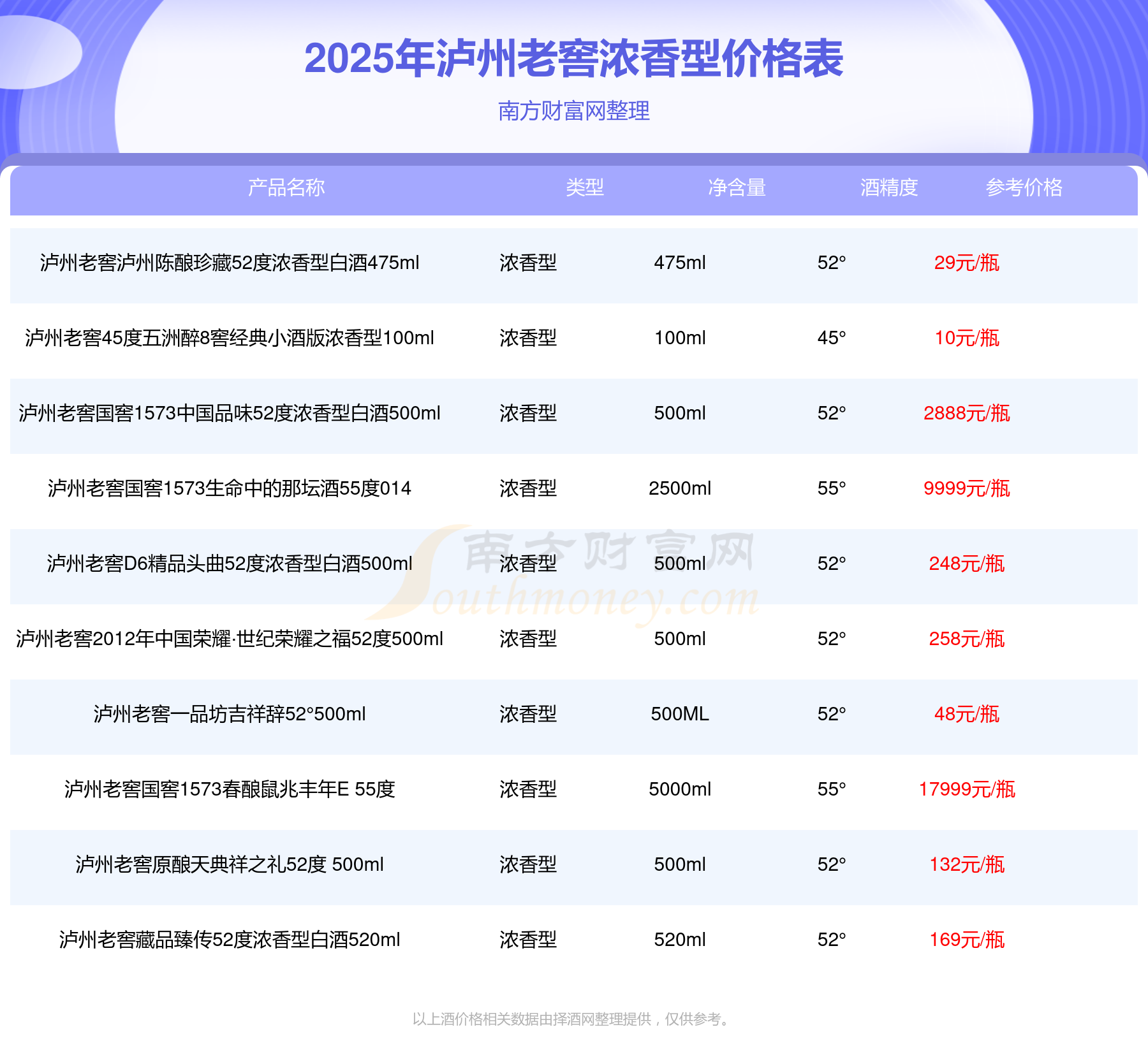 瀘州老窖濃香型酒最新價(jià)格2025:瀘州老窖國(guó)窖1573春釀鼠兆豐年E 55度參考價(jià)17999元/瓶、瀘州老窖國(guó)窖1573生命中的那壇酒55度014參考價(jià)9999元/瓶、瀘州老窖國(guó)窖1573春釀鼠兆豐年A 55度參考價(jià)5088元/瓶、瀘州老窖國(guó)窖1573生命中的那壇酒55度013濃香型白酒1000ml參考價(jià)4988元/瓶、瀘州老窖國(guó)窖1573生命中的那壇酒55度009 1000ml參考價(jià)4288元/瓶。