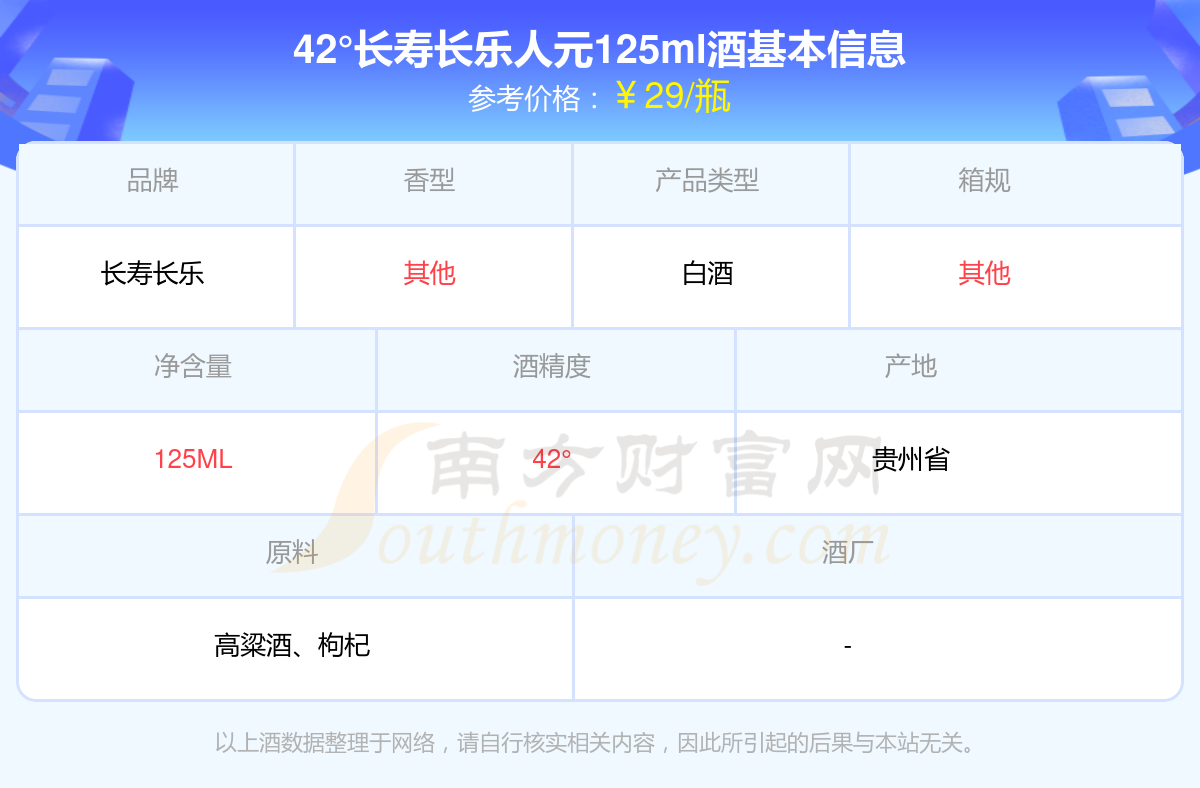 2025年42°長壽長樂人元125ml酒價格多少錢一瓶?