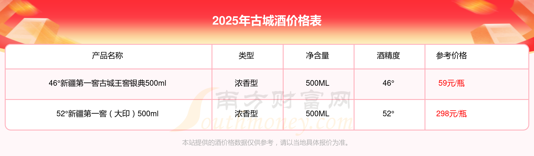 2025年,52°新疆第一窖(大。500ml、46°新疆第一窖古城王窖銀典500ml等古城酒價格如下:52°新疆第一窖(大。500ml參考價298元/瓶、46°新疆第一窖古城王窖銀典500ml參考價59元/瓶。