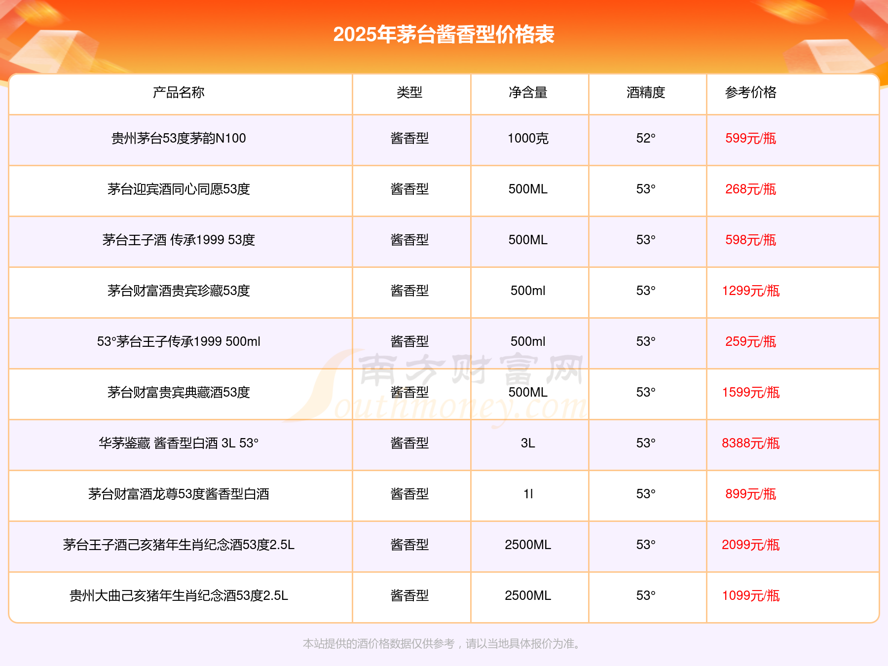 茅臺醬香型酒最新價格2025:華茅鑒藏 醬香型白酒 3L 53°參考價8388元/瓶、53度五星茅臺生肖酒丁酉雞年參考價2798元/瓶、貴州茅臺己亥豬年生肖酒53°500ml參考價2699元/瓶、53度五星茅臺生肖酒戊戌狗年參考價2698元/瓶、飛天茅臺53°500ml(2015年)參考價2199元/瓶、茅臺王子酒己亥豬年生肖紀念酒53度2.5L參考價2099元/瓶。