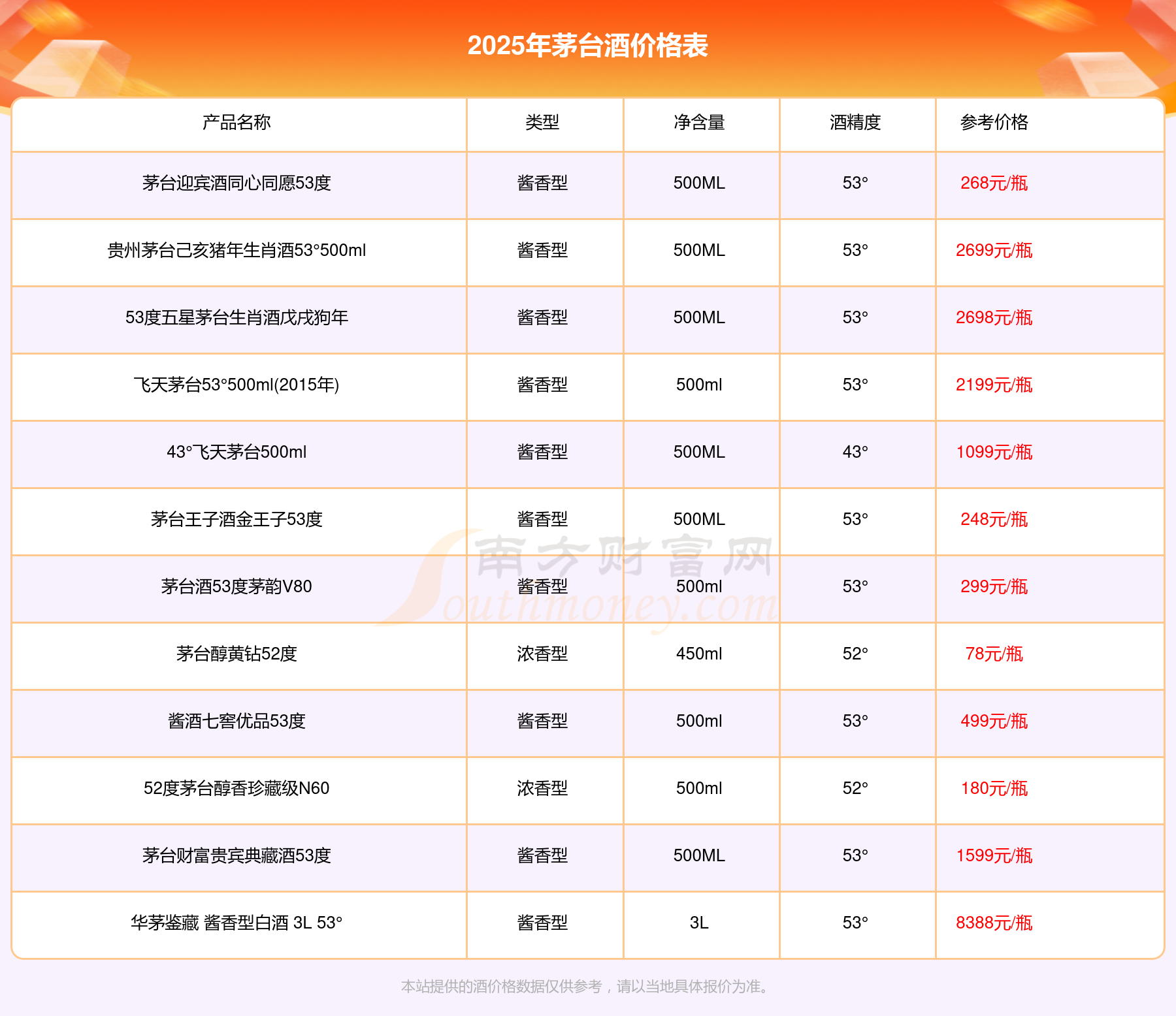 2025年,華茅鑒藏 醬香型白酒 3L 53°、53度五星茅臺生肖酒丁酉雞年、貴州茅臺己亥豬年生肖酒53°500ml、53度五星茅臺生肖酒戊戌狗年等茅臺酒價格如下:華茅鑒藏 醬香型白酒 3L 53°參考價8388元/瓶、53度五星茅臺生肖酒丁酉雞年參考價2798元/瓶、貴州茅臺己亥豬年生肖酒53°500ml參考價2699元/瓶、53度五星茅臺生肖酒戊戌狗年參考價2698元/瓶。
