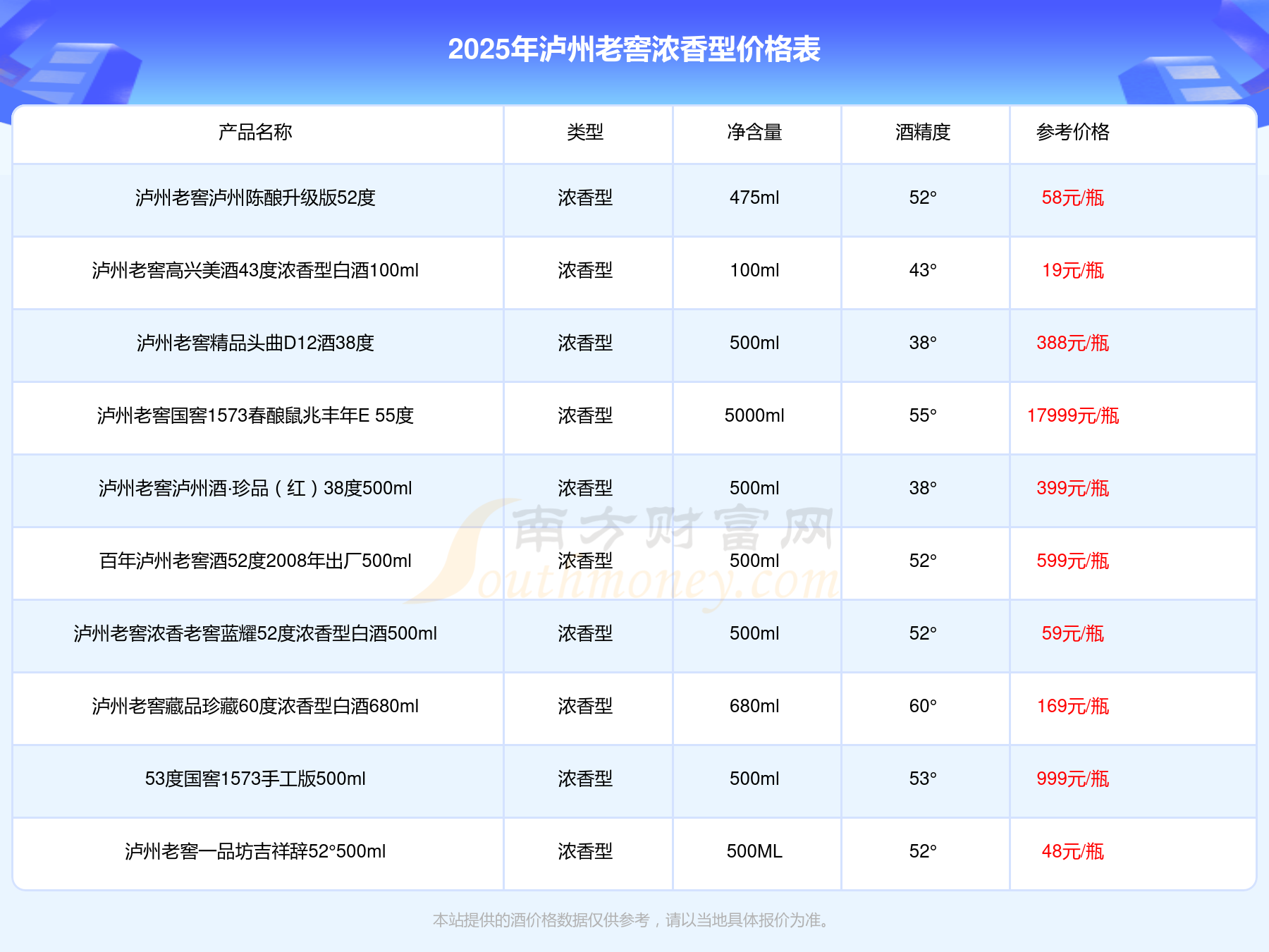 瀘州老窖國窖1573春釀鼠兆豐年E 55度參考價17999元/瓶、瀘州老窖國窖1573生命中的那壇酒55度014參考價9999元/瓶、瀘州老窖國窖1573春釀鼠兆豐年A 55度參考價5088元/瓶。