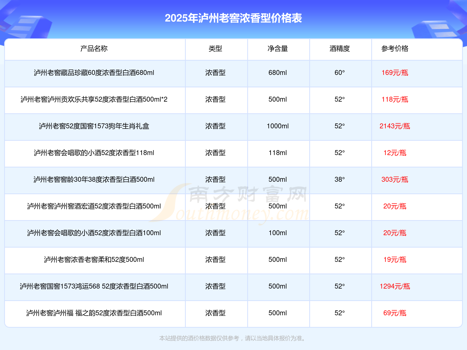 瀘州老窖濃香型酒最新價(jià)格2025: