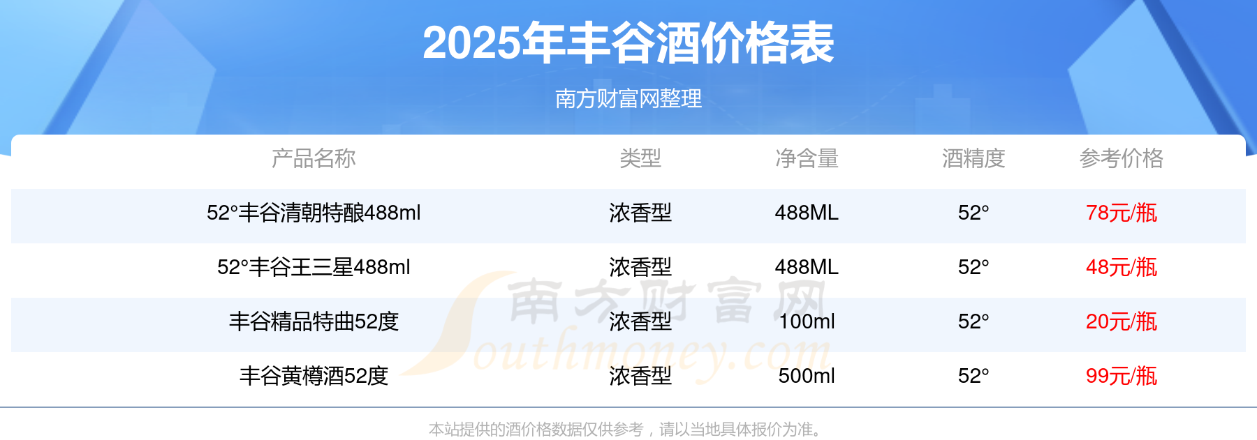 豐谷黃樽酒52度參考價99元/瓶、52°豐谷清朝特釀488ml參考價78元/瓶、52°豐谷王三星488ml參考價48元/瓶、豐谷精品特曲52度參考價20元/瓶。