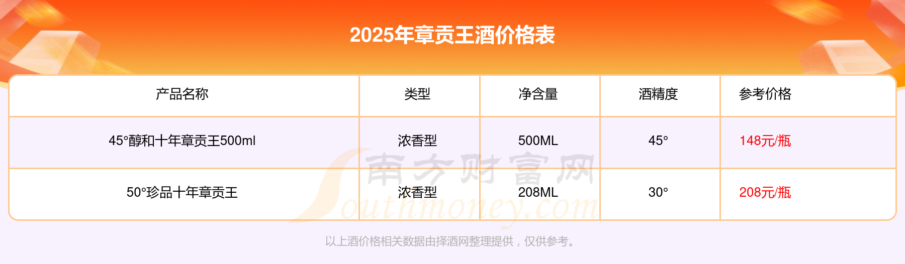 50°珍品十年章貢王參考價(jià)208元/瓶、45°醇和十年章貢王500ml參考價(jià)148元/瓶。