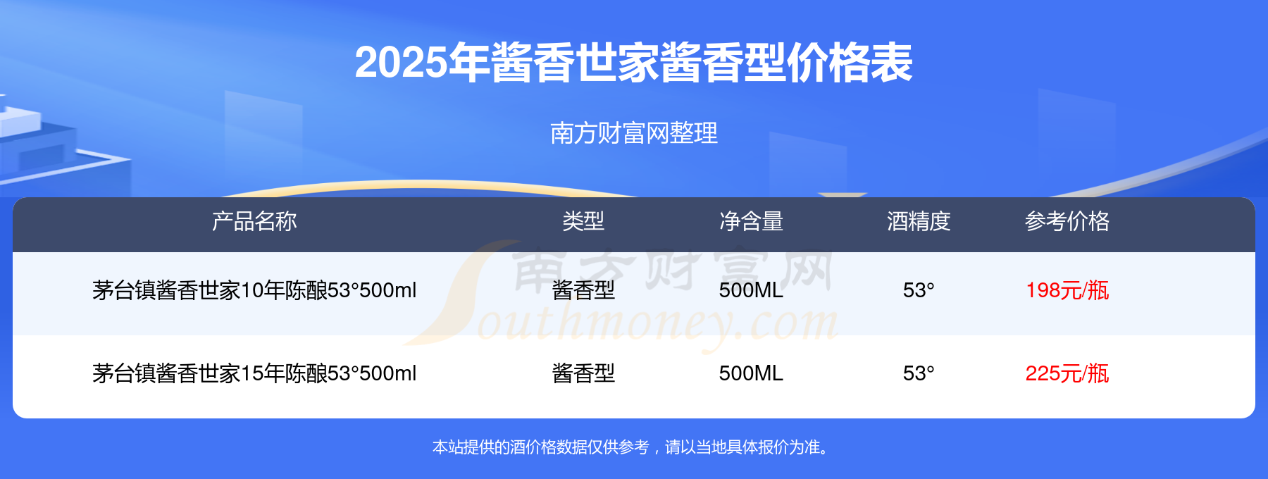 2025年,醬香世家醬香型酒價(jià)格最高的是茅臺(tái)鎮(zhèn)醬香世家15年陳釀53°500ml,參考價(jià)225元,最低的是茅臺(tái)鎮(zhèn)醬香世家10年陳釀53°500ml,參考價(jià)198元,價(jià)格高低差為27元。