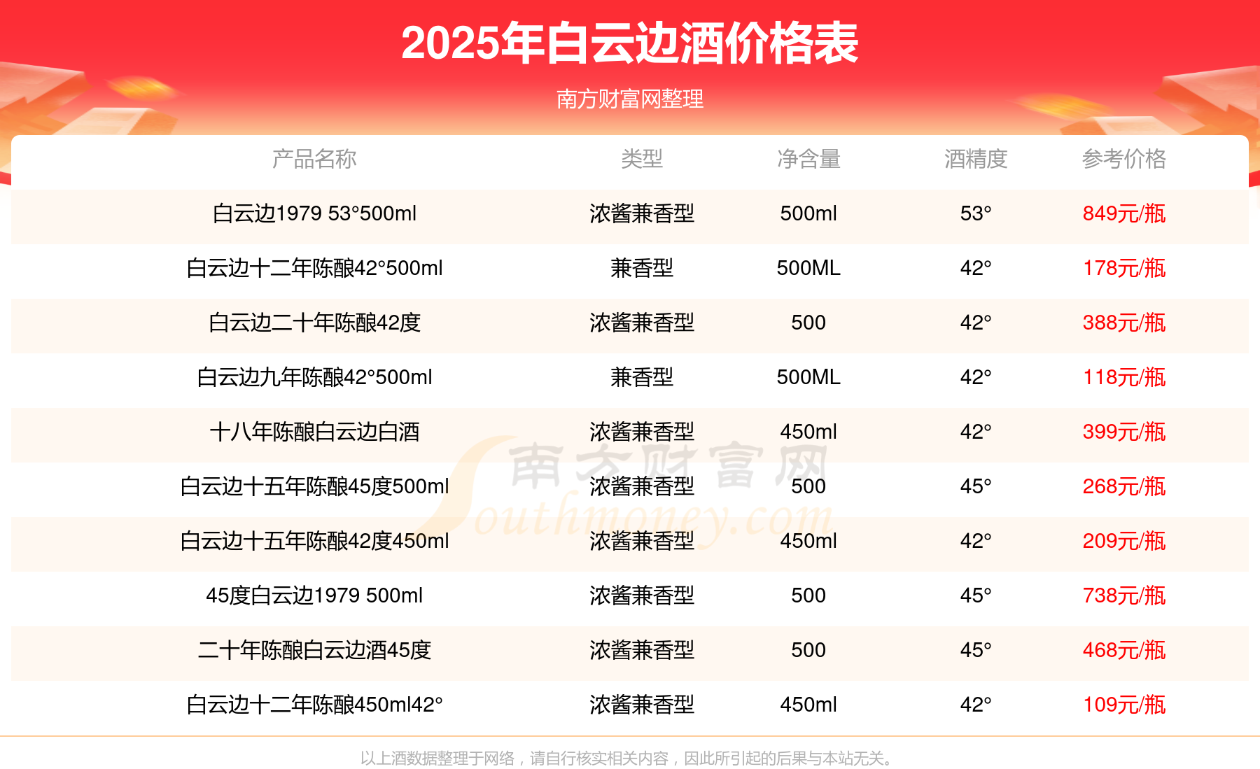 白云邊1979 53°500ml參考價(jià)849元/瓶、45度白云邊1979 500ml參考價(jià)738元/瓶、二十年陳釀白云邊酒45度參考價(jià)468元/瓶、十八年陳釀白云邊白酒參考價(jià)399元/瓶、白云邊二十年陳釀42度參考價(jià)388元/瓶、白云邊十五年陳釀45度500ml參考價(jià)268元/瓶、白云邊十五年陳釀42度450ml參考價(jià)209元/瓶。