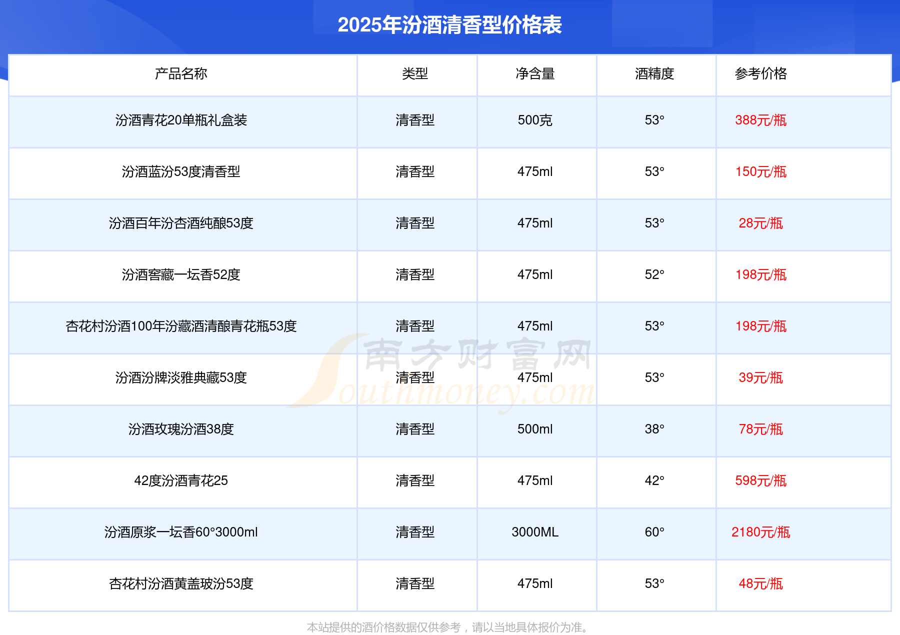2025汾酒清香型酒最新價格:汾酒原漿一壇香60°3000ml參考價2180元/瓶、汾酒原漿一壇香60°1500ml參考價1536元/瓶、42度汾酒青花25參考價598元/瓶、汾酒收藏系列盤古汾酒55度參考價400元/瓶。