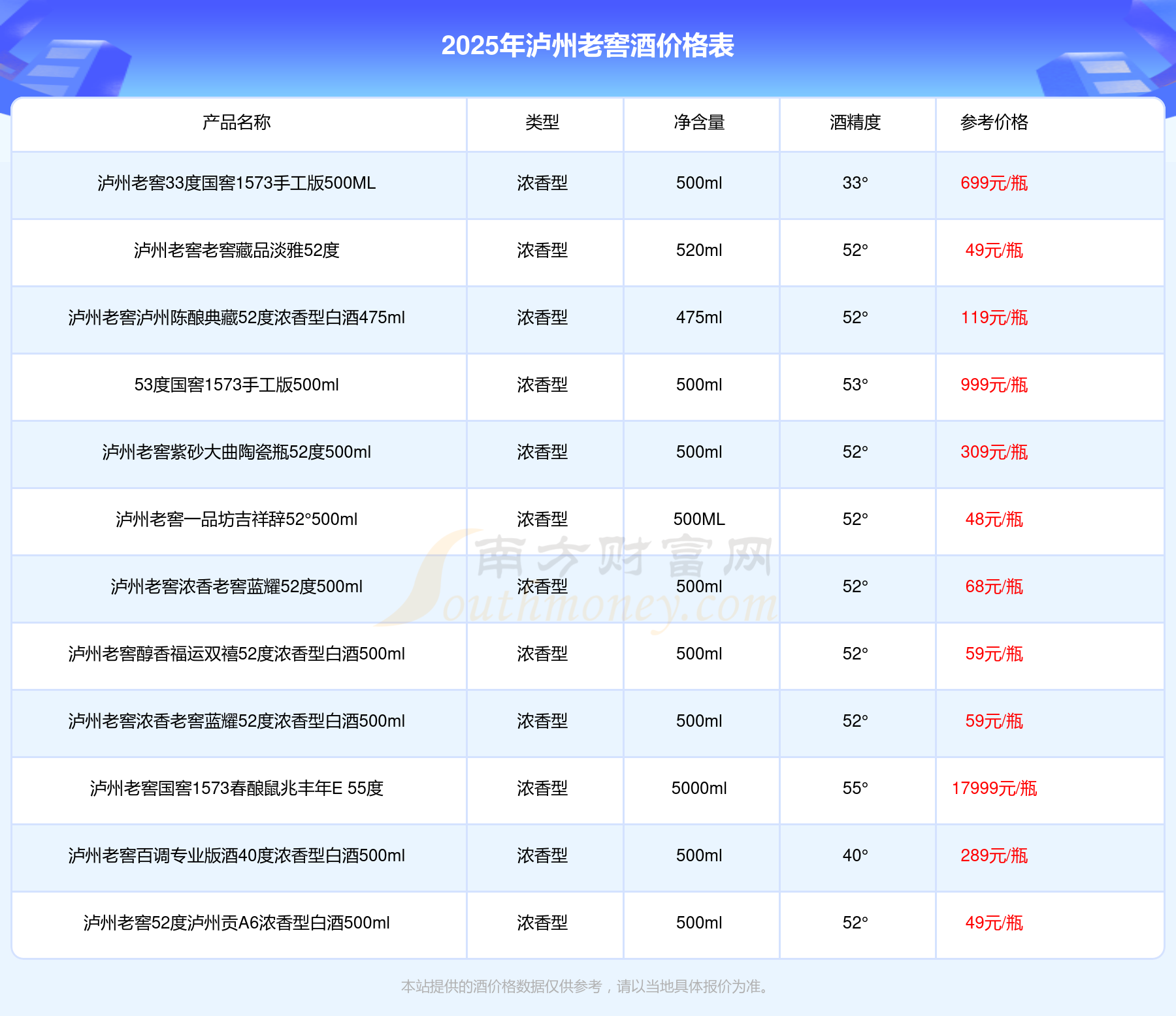 瀘州老窖酒最新價(jià)格2025:瀘州老窖國窖1573春釀鼠兆豐年E 55度參考價(jià)17999元/瓶、瀘州老窖國窖1573生命中的那壇酒55度014參考價(jià)9999元/瓶、瀘州老窖國窖1573春釀鼠兆豐年A 55度參考價(jià)5088元/瓶、瀘州老窖國窖1573生命中的那壇酒55度013濃香型白酒1000ml參考價(jià)4988元/瓶、瀘州老窖國窖1573生命中的那壇酒55度009 1000ml參考價(jià)4288元/瓶。
