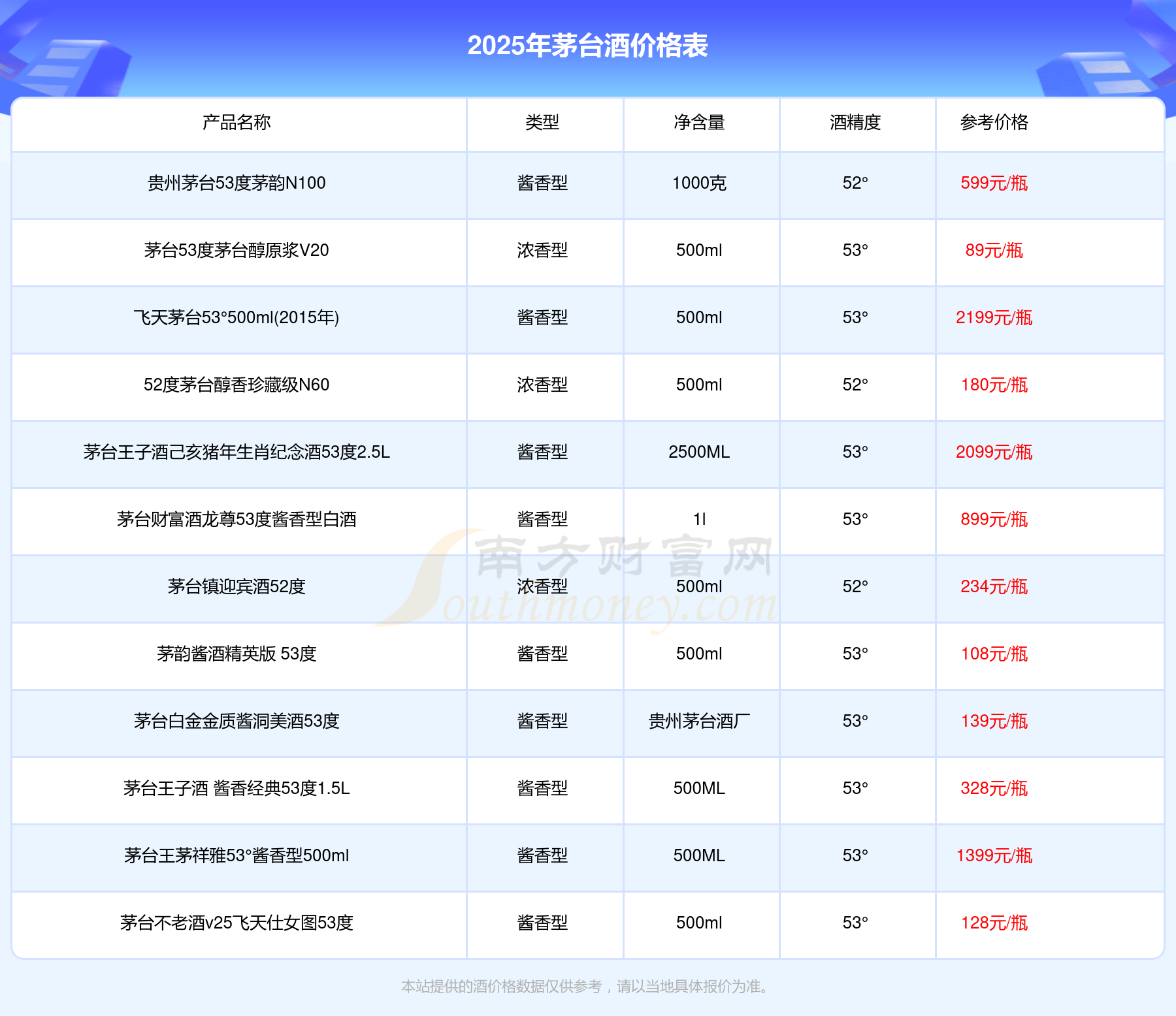 2025年,華茅鑒藏 醬香型白酒 3L 53°、53度五星茅臺生肖酒丁酉雞年、貴州茅臺己亥豬年生肖酒53°500ml、53度五星茅臺生肖酒戊戌狗年、飛天茅臺53°500ml(2015年)、茅臺王子酒己亥豬年生肖紀念酒53度2.5L、茅臺1935醬香型53度等茅臺酒價格如下:華茅鑒藏 醬香型白酒 3L 53°參考價8388元/瓶、53度五星茅臺生肖酒丁酉雞年參考價2798元/瓶、貴州茅臺己亥豬年生肖酒53°500ml參考價2699元/瓶、53度五星茅臺生肖酒戊戌狗年參考價2698元/瓶、飛天茅臺53°500ml(2015年)參考價2199元/瓶、茅臺王子酒己亥豬年生肖紀念酒53度2.5L參考價2099元/瓶、茅臺1935醬香型53度參考價1799元/瓶。