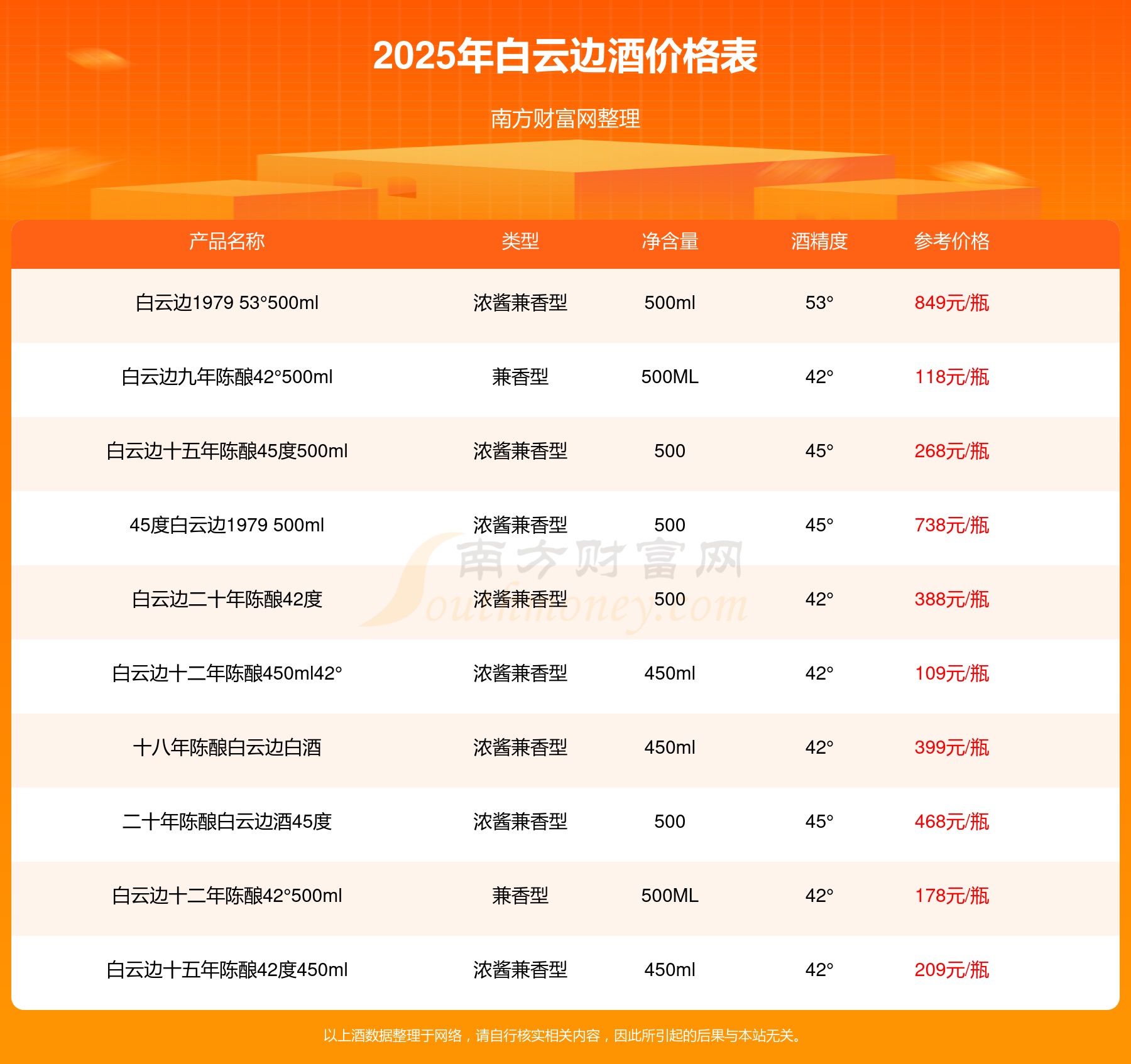2025年白云邊酒白云邊1979 53°500ml、45度白云邊1979 500ml、二十年陳釀白云邊酒45度、十八年陳釀白云邊白酒等最新價(jià)格如下:白云邊1979 53°500ml參考價(jià)849元/瓶、45度白云邊1979 500ml參考價(jià)738元/瓶、二十年陳釀白云邊酒45度參考價(jià)468元/瓶、十八年陳釀白云邊白酒參考價(jià)399元/瓶。