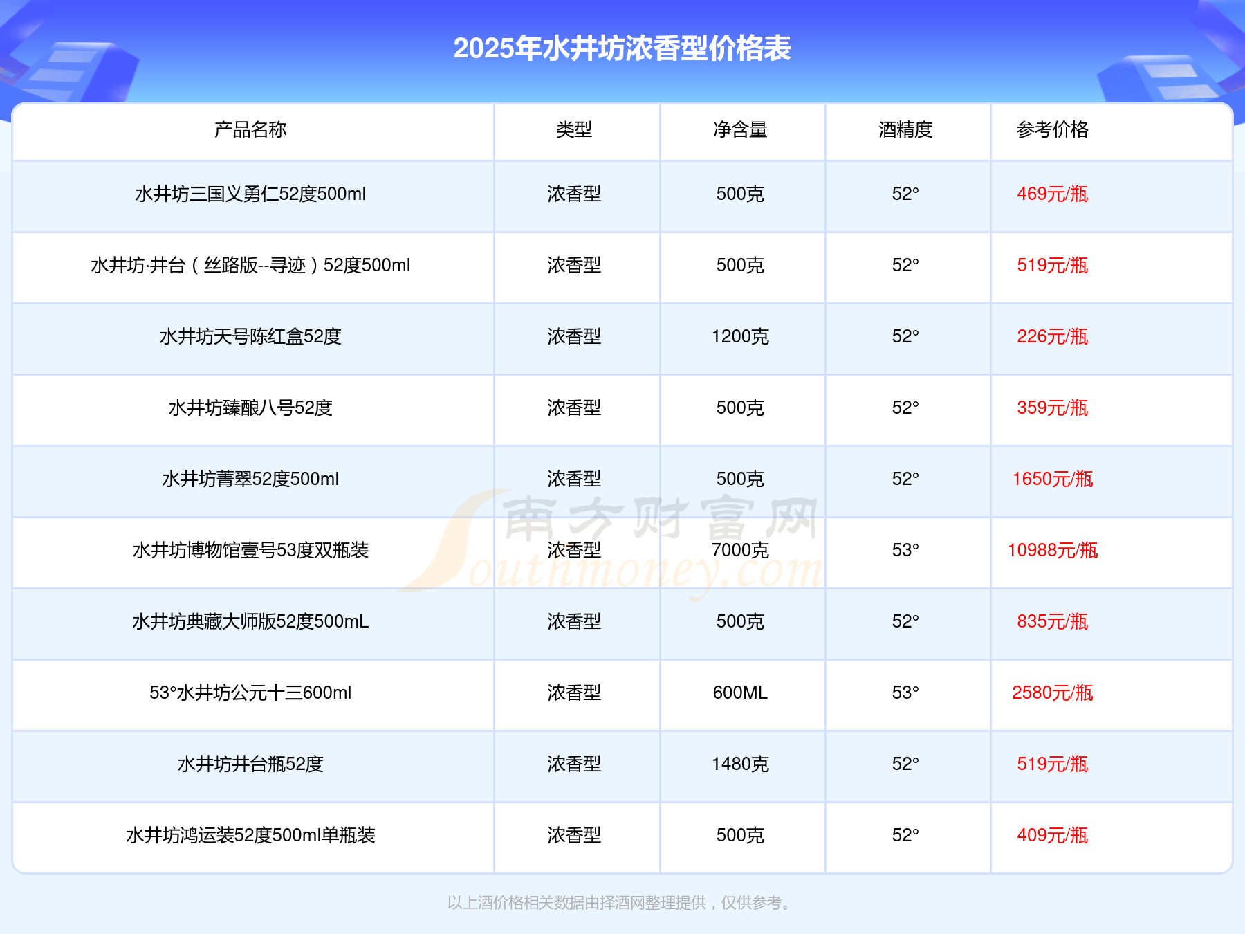 2025年,水井坊大壇收藏級(jí)原漿天球瓶66度、水井坊博物館壹號(hào)53度雙瓶裝、53°水井坊公元十三600ml、水井坊梅蘭竹菊52度濃香型600ml4瓶、水井坊菁翠52度500ml、井臺(tái)珍藏版龍53度1000ml單瓶裝、井臺(tái)珍藏版鳳53度1000ml單瓶裝等水井坊濃香型酒價(jià)格如下:水井坊大壇收藏級(jí)原漿天球瓶66度參考價(jià)13999元/瓶、水井坊博物館壹號(hào)53度雙瓶裝參考價(jià)10988元/瓶、53°水井坊公元十三600ml參考價(jià)2580元/瓶、水井坊梅蘭竹菊52度濃香型600ml4瓶參考價(jià)1999元/瓶、水井坊菁翠52度500ml參考價(jià)1650元/瓶、井臺(tái)珍藏版龍53度1000ml單瓶裝參考價(jià)1298元/瓶、井臺(tái)珍藏版鳳53度1000ml單瓶裝參考價(jià)1298元/瓶。