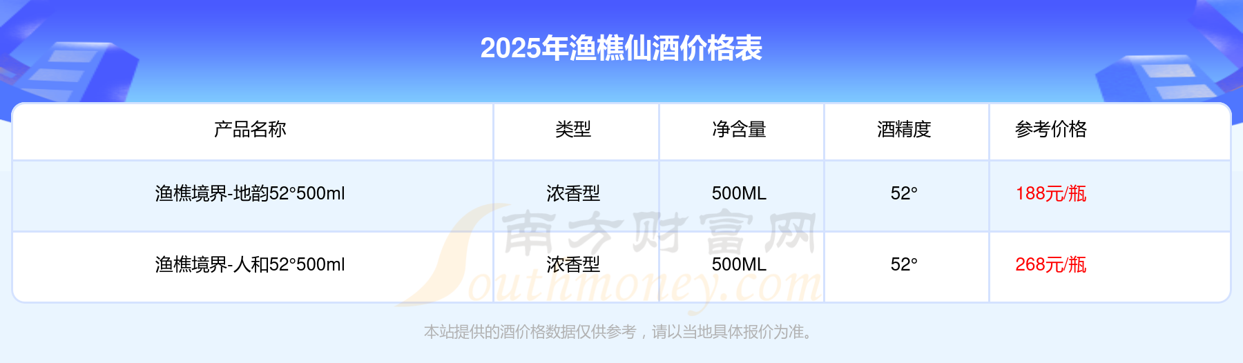 2025年,漁樵仙酒價(jià)格最高的是漁樵境界-人和52°500ml,參考價(jià)268元,參考價(jià)188元,價(jià)格高低差為80元。