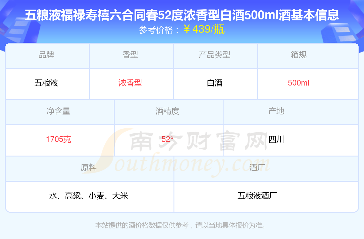 五糧液福祿壽禧六合同春52度濃香型白酒500ml基本信息