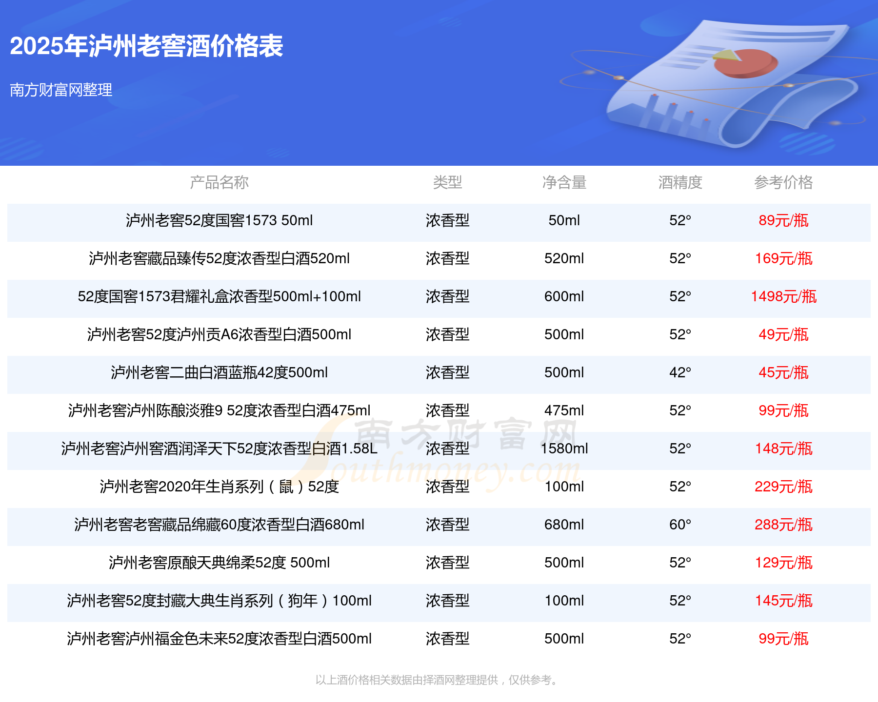 2025年瀘州老窖酒瀘州老窖國窖1573春釀鼠兆豐年E 55度、瀘州老窖國窖1573生命中的那壇酒55度014、瀘州老窖國窖1573春釀鼠兆豐年A 55度、瀘州老窖國窖1573生命中的那壇酒55度013濃香型白酒1000ml、瀘州老窖國窖1573生命中的那壇酒55度009 1000ml、瀘州老窖國窖1573中國品味52度濃香型白酒500ml、瀘州老窖國窖1573許燎源概念作品58度濃香型白酒1000ml等最新價格如下:瀘州老窖國窖1573春釀鼠兆豐年E 55度參考價17999元/瓶、瀘州老窖國窖1573生命中的那壇酒55度014參考價9999元/瓶、瀘州老窖國窖1573春釀鼠兆豐年A 55度參考價5088元/瓶、瀘州老窖國窖1573生命中的那壇酒55度013濃香型白酒1000ml參考價4988元/瓶、瀘州老窖國窖1573生命中的那壇酒55度009 1000ml參考價4288元/瓶、瀘州老窖國窖1573中國品味52度濃香型白酒500ml參考價2888元/瓶、瀘州老窖國窖1573許燎源概念作品58度濃香型白酒1000ml參考價2680元/瓶。