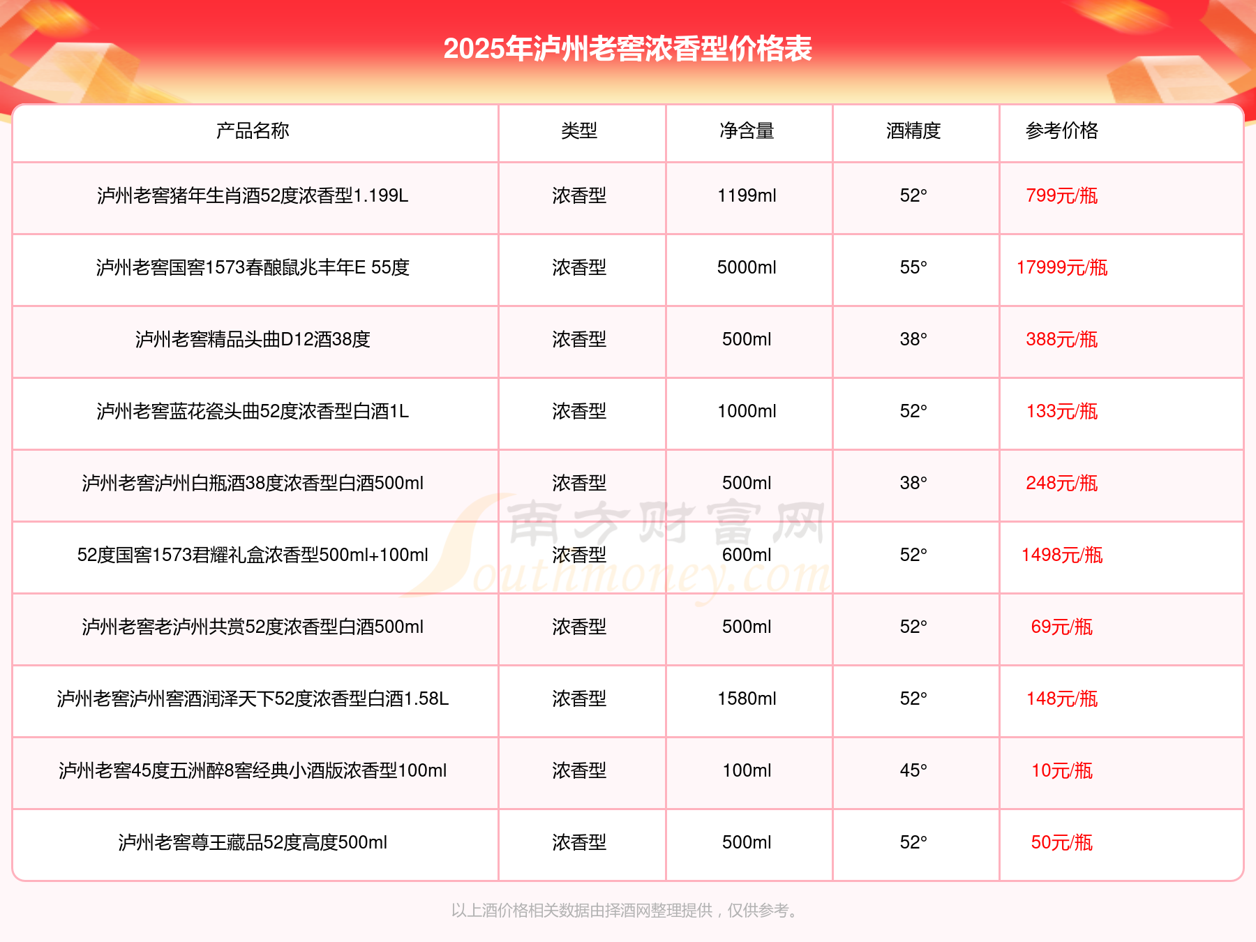 2025年,瀘州老窖濃香型酒價(jià)格最高的是瀘州老窖國(guó)窖1573春釀鼠兆豐年E 55度,參考價(jià)17999元,最低的是瀘州老窖45度五洲醉8窖經(jīng)典小酒版濃香型100ml,參考價(jià)10元,價(jià)格高低差為17989元。